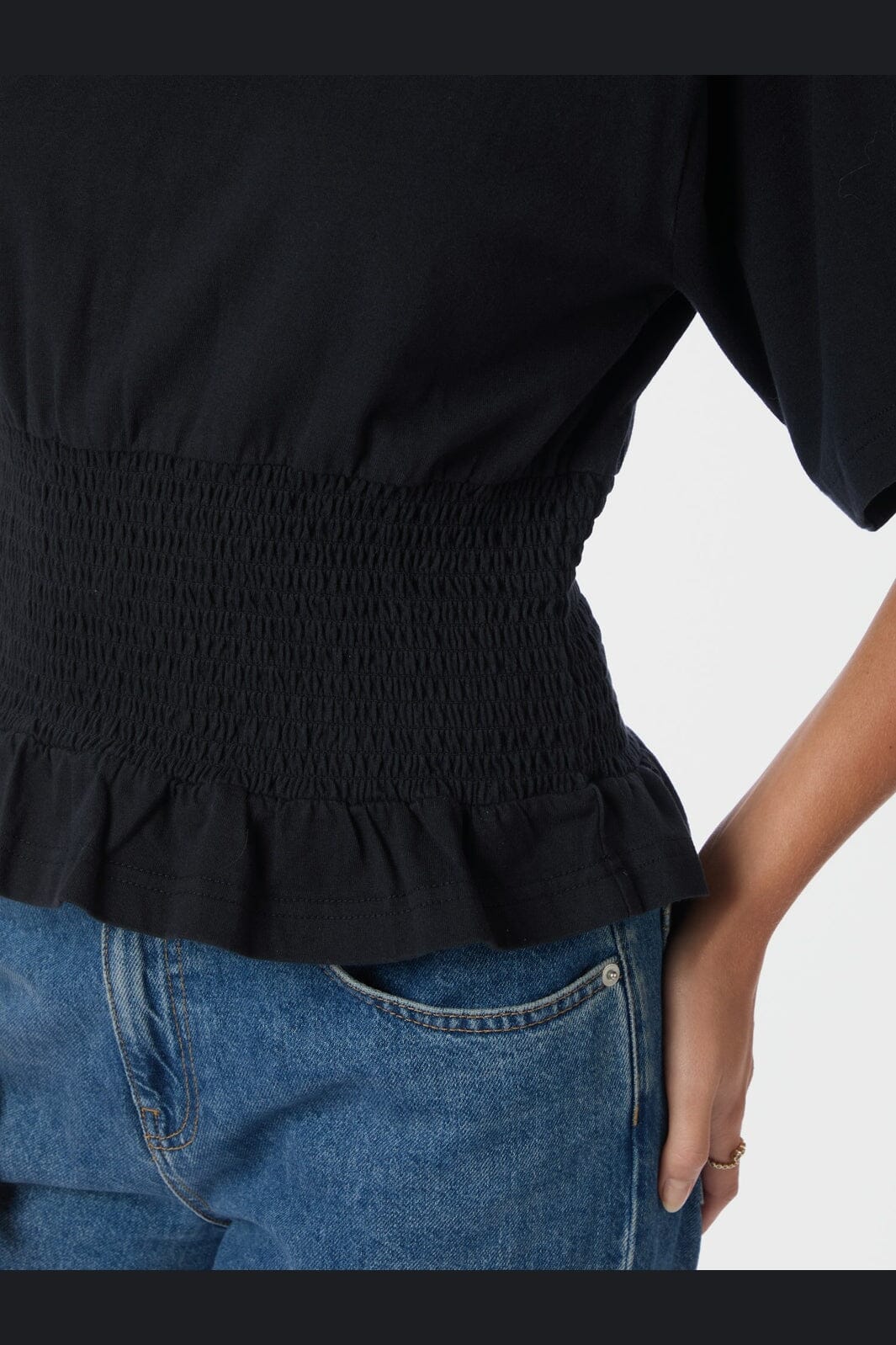 Mørkeblå T-shirt fra Neo Noir med boxy pasform og smock-detalje i taljen. Den er lavet i blød bomuldskvalitet og har korte ærmer samt en rund halsudskæring.