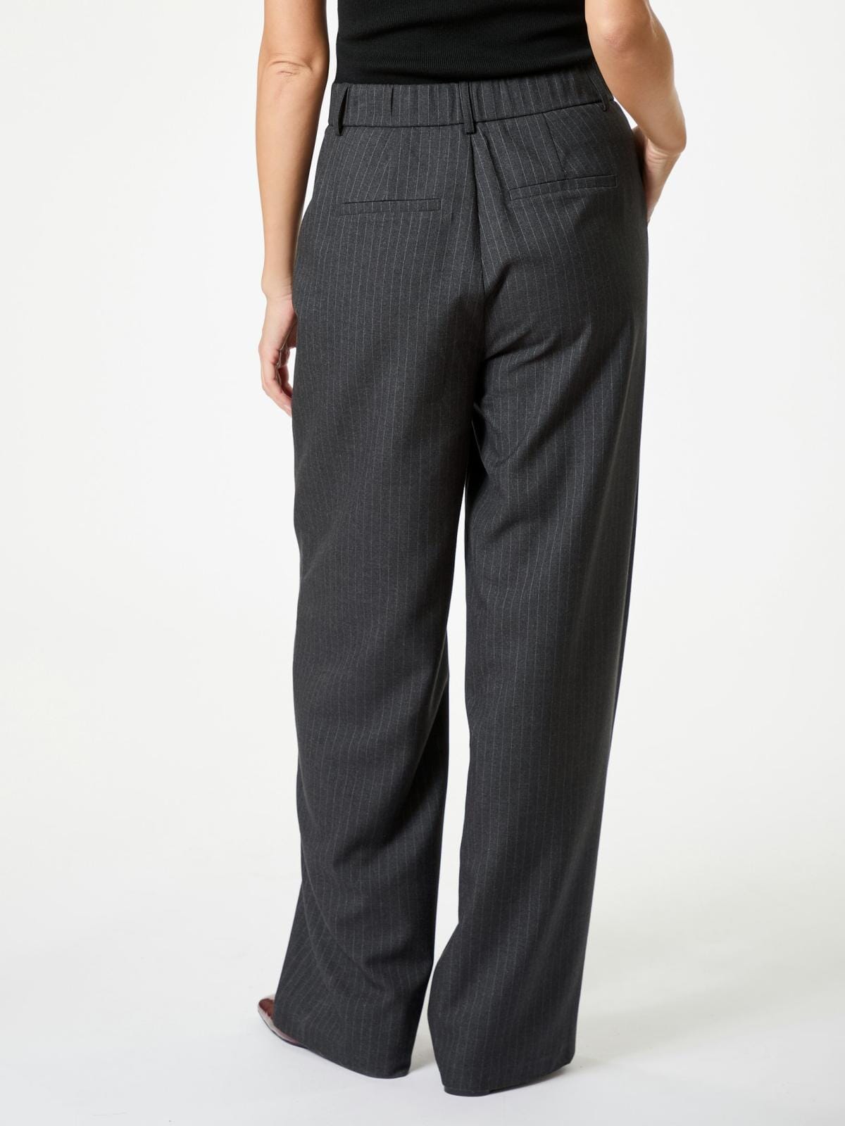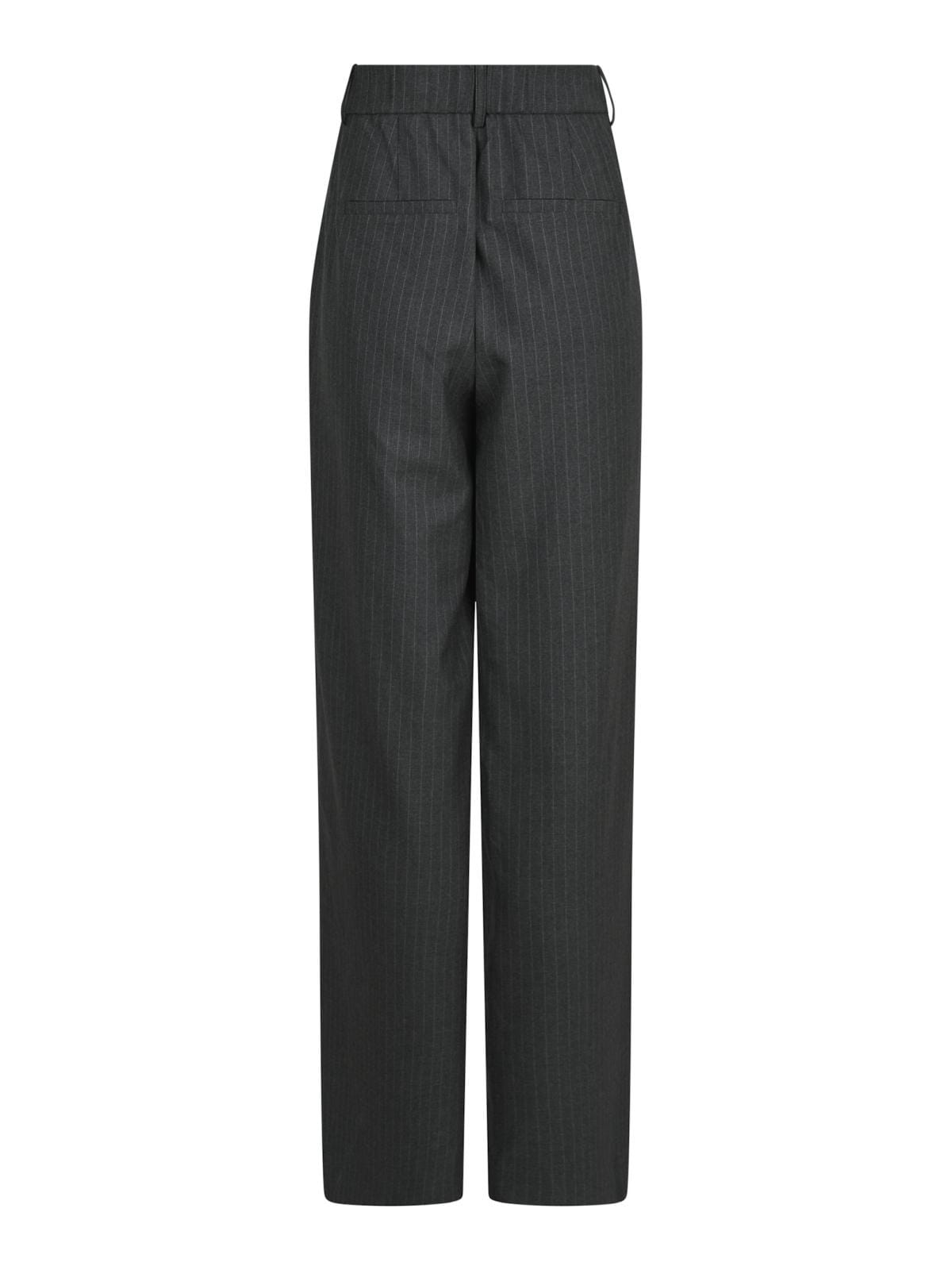 Antracitfarvede bukser med nålestribet mønster fra Neo Noir. Bukserne har en bred benstil og går ned til gulvet. De lukkes med lynlås og knapper i taljen.