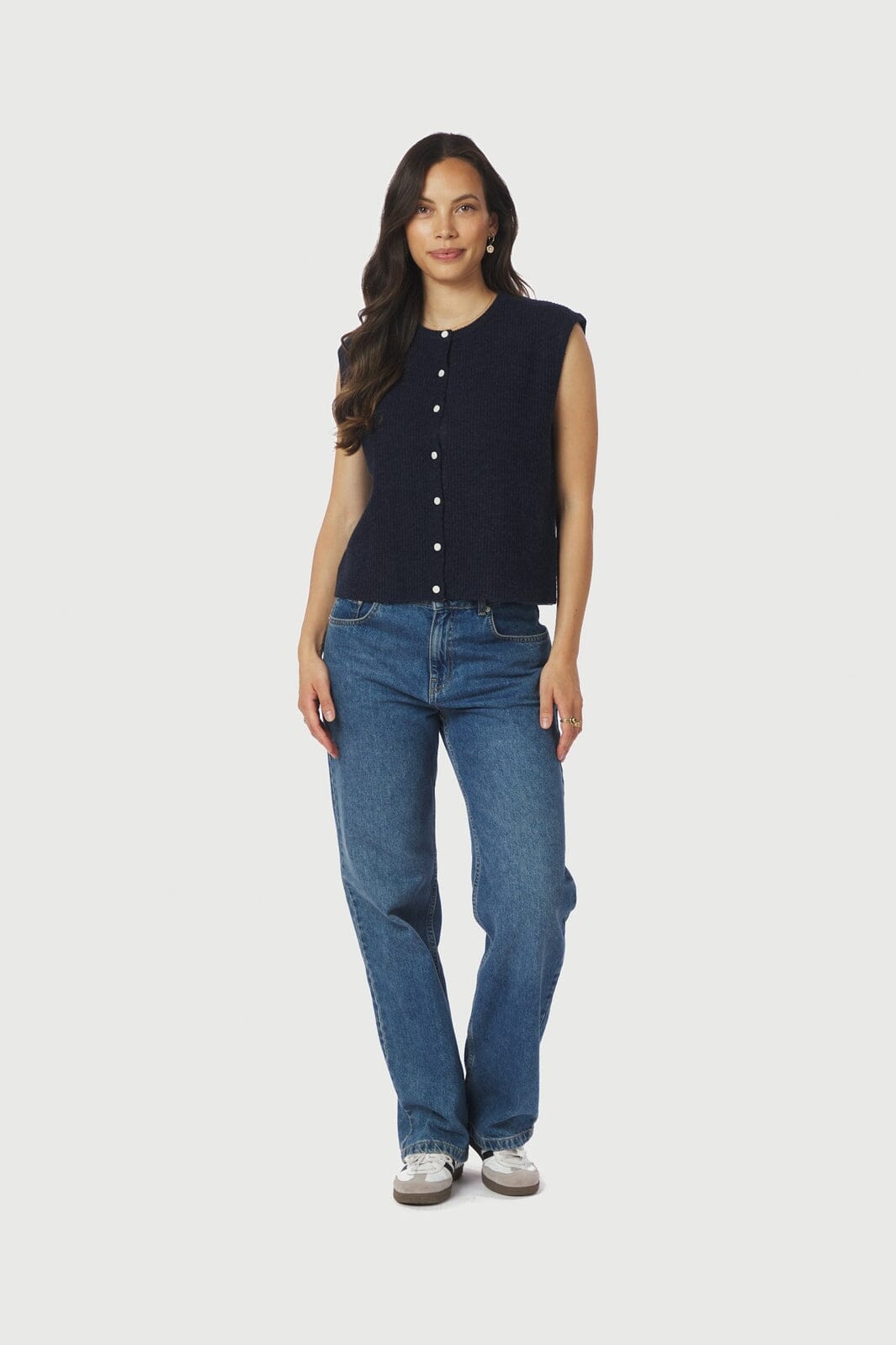Strikket vest fra Neo Noir i mørkeblå. Den har en løs pasform med rund halsudskæring og perleknaplukning foran.