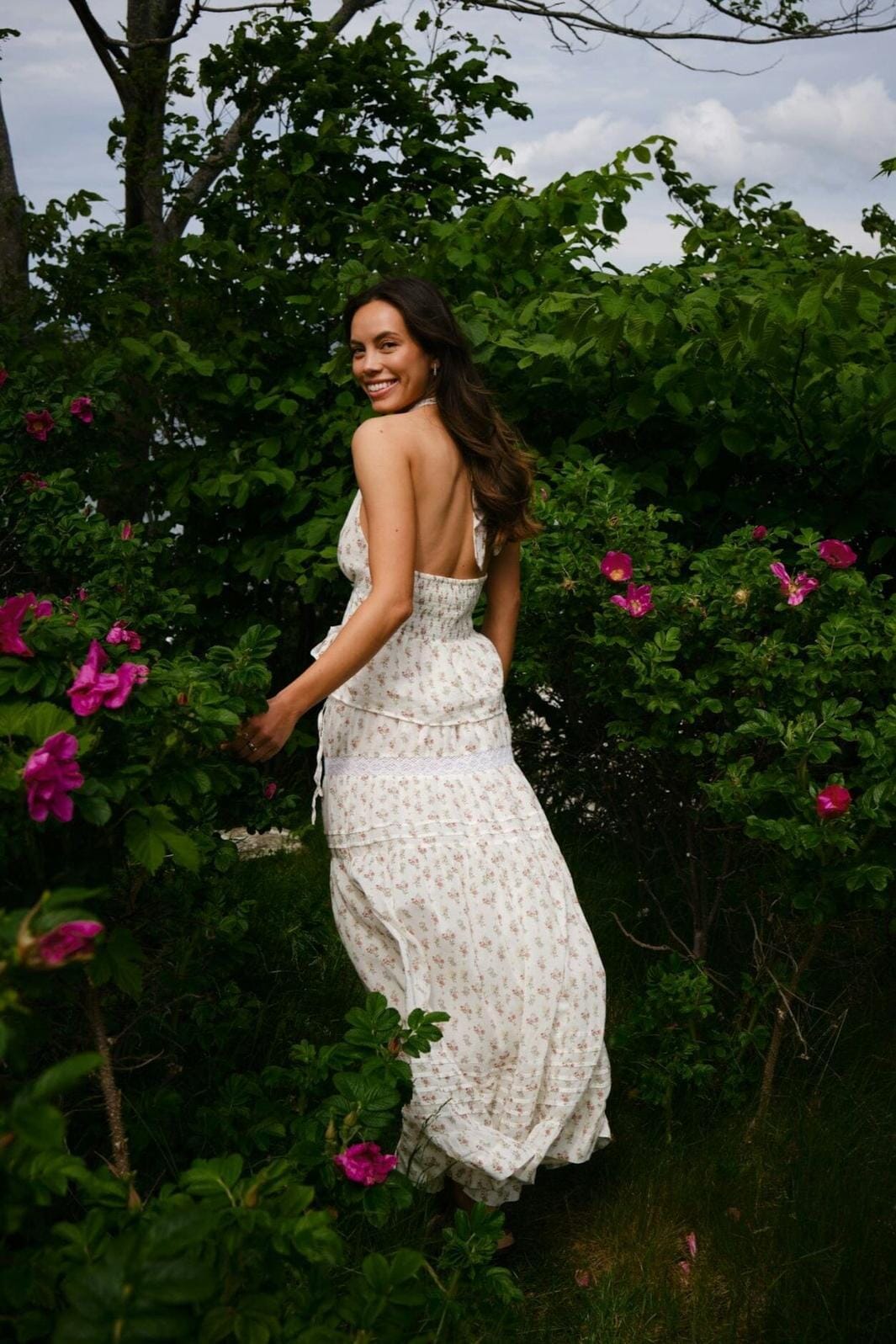 Lang nederdel fra Neo Noir i creme med små lyserøde blomster. Nederdelen har flæser og læg, der skaber bevægelse i stoffet, samt en elastisk talje med bindebånd.