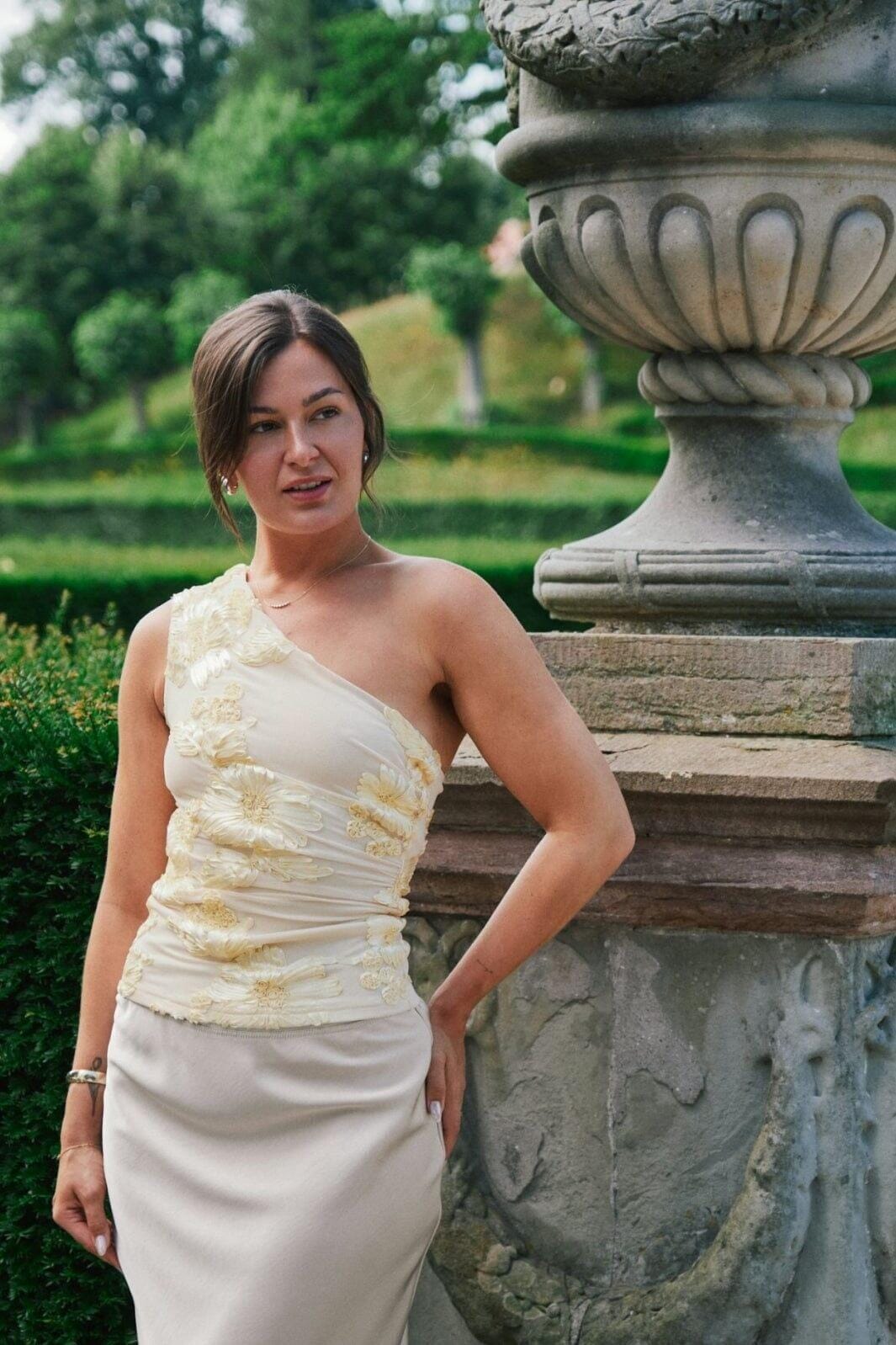 sød one shoulder top i mesh kvalitet med 3D blomster detaljer, Modellen er 176 cm og bærer en størrelse 36