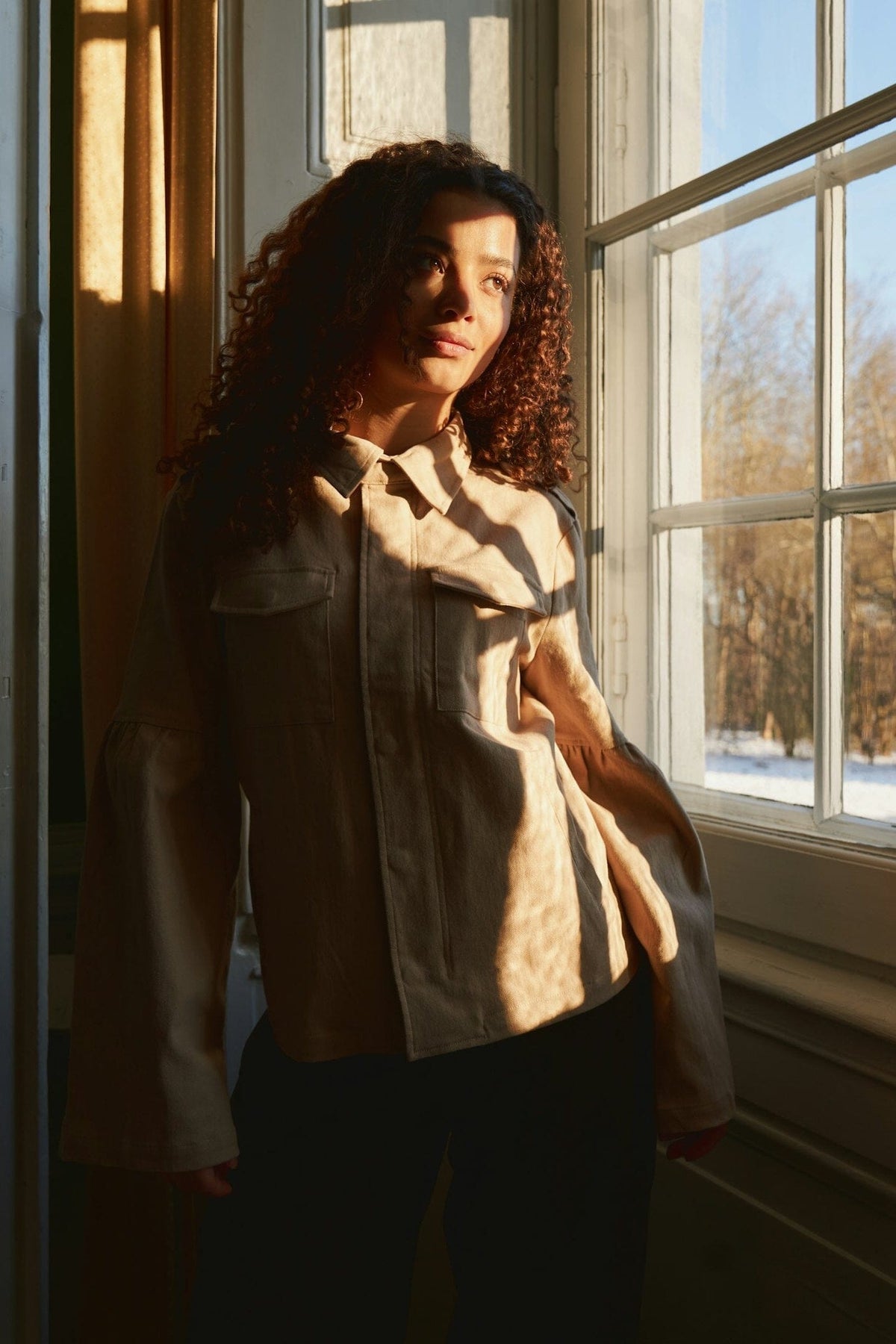 Sandfarvet jakke fra Neo Noir, fremstillet af 90 % bomuld, 8 % polyester og 2 % elastan. Jakken har en klassisk skjortekrave, to brystlommer med flapper og lange ærmer med pufdetalje ved skuldrene.