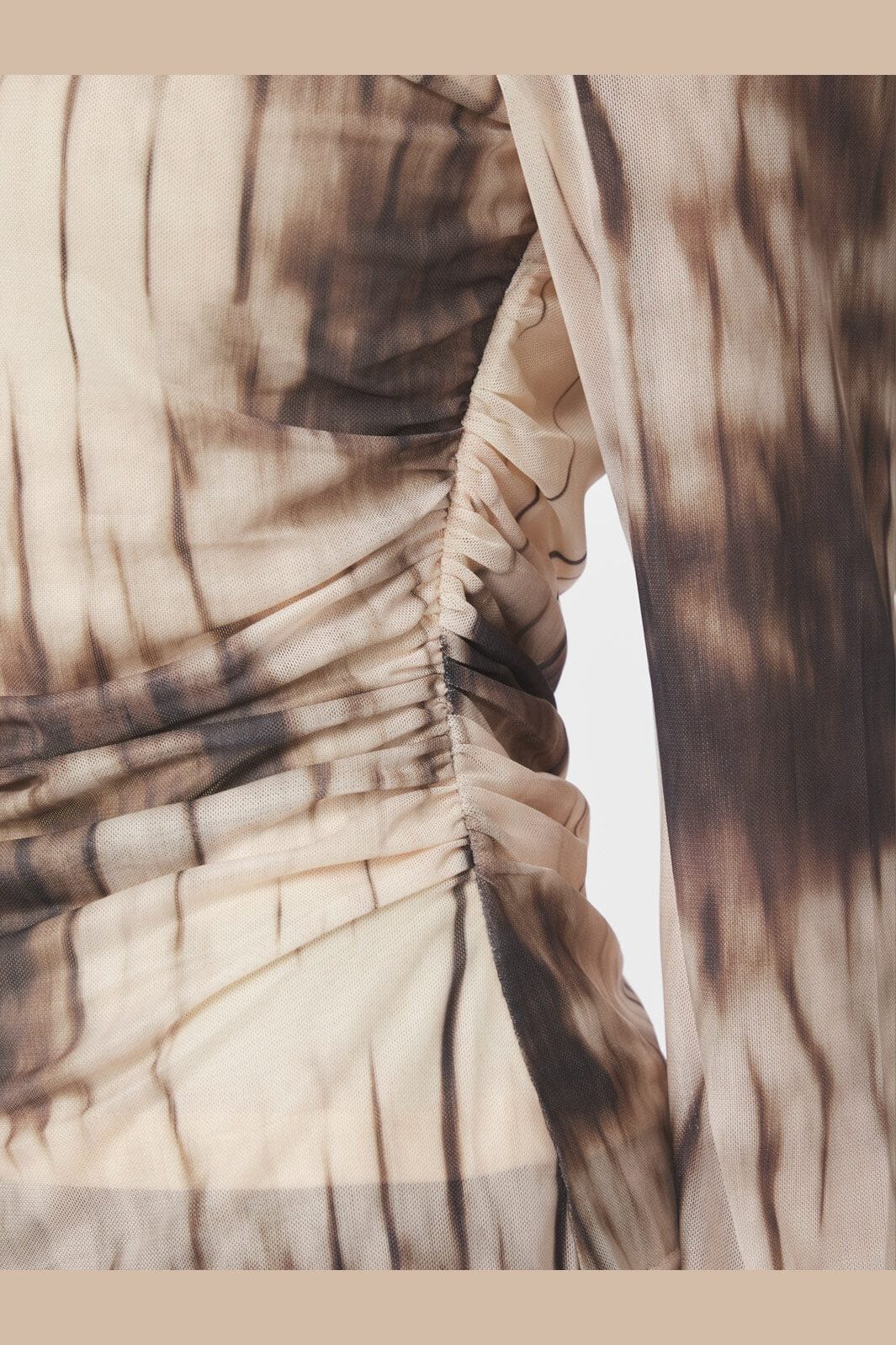 Meshbluse fra Neo Noir i brun nuance med et faded print. Blusen har rynkedetaljer ved taljen og lange ærmer med vidde.