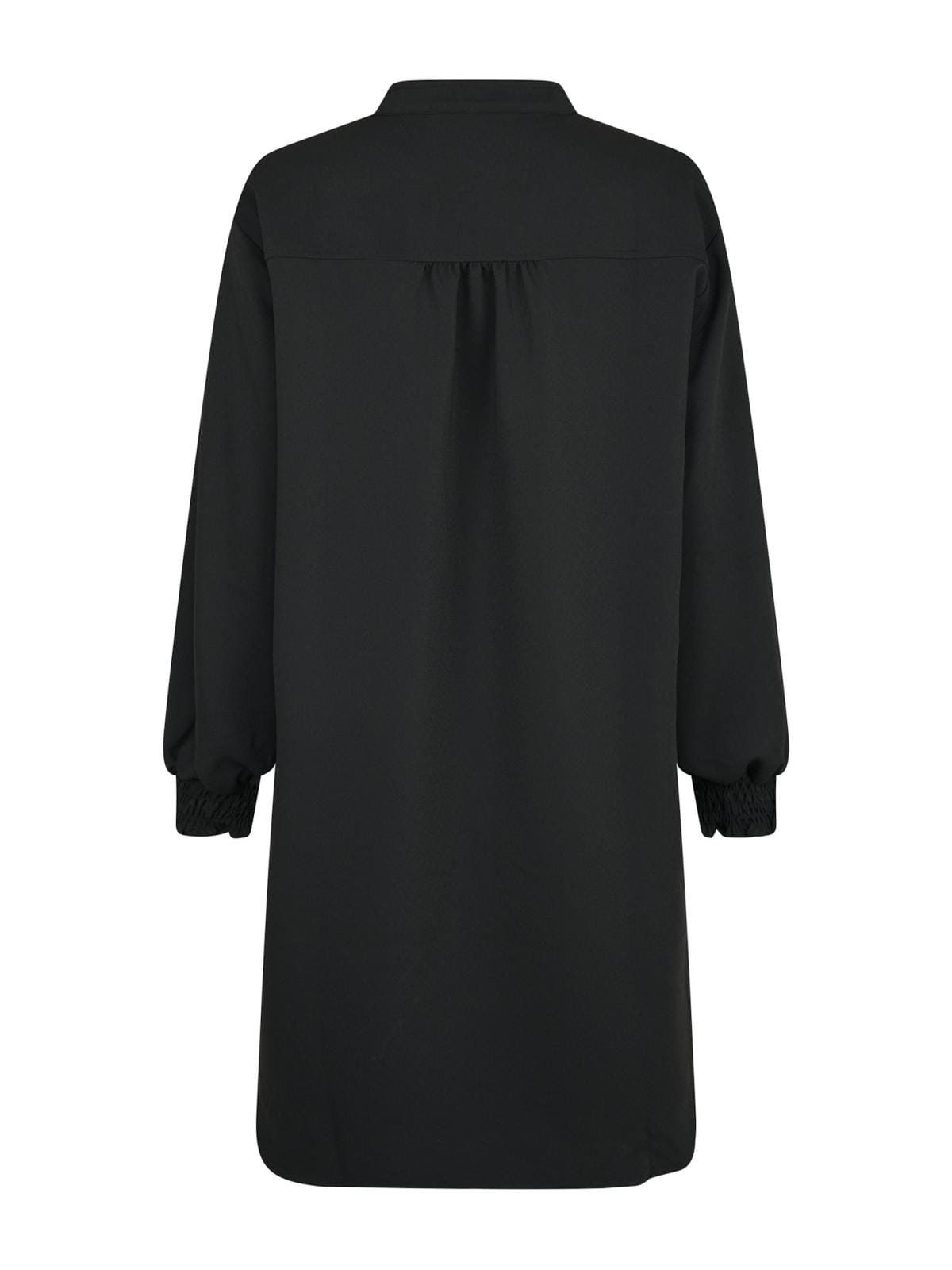 Sort crepekjole med V-halsudskæring og pufærmer. Kjolen har en løs pasform og slids i siden, der giver god bevægelighed.