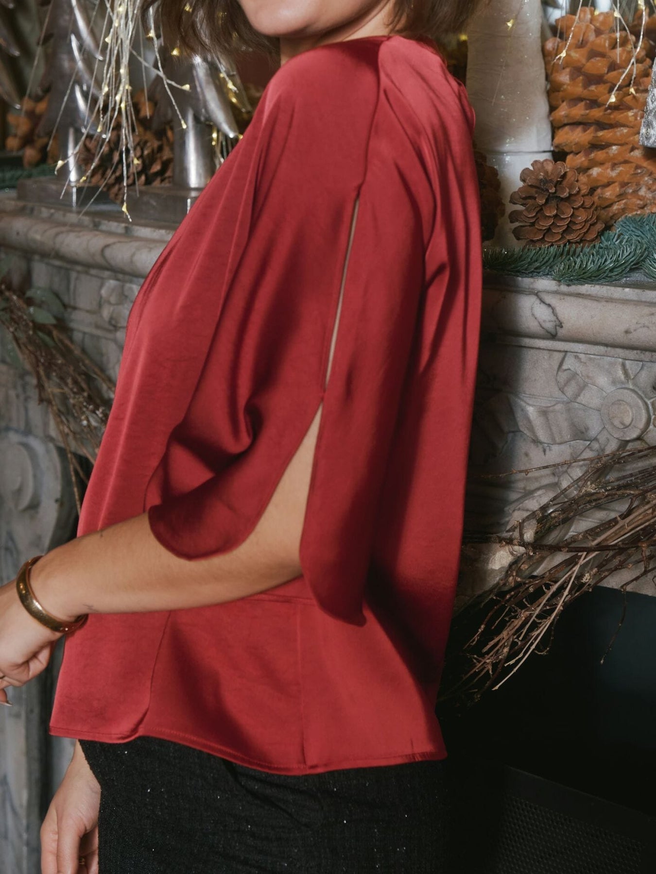 Mørkerød bluse fra Neo Noir i satin kvalitet. Blusen har rund halsudskæring og trekvartlange ærmer med slids. En knaplukning på ryggen giver nem af- og påtagning.