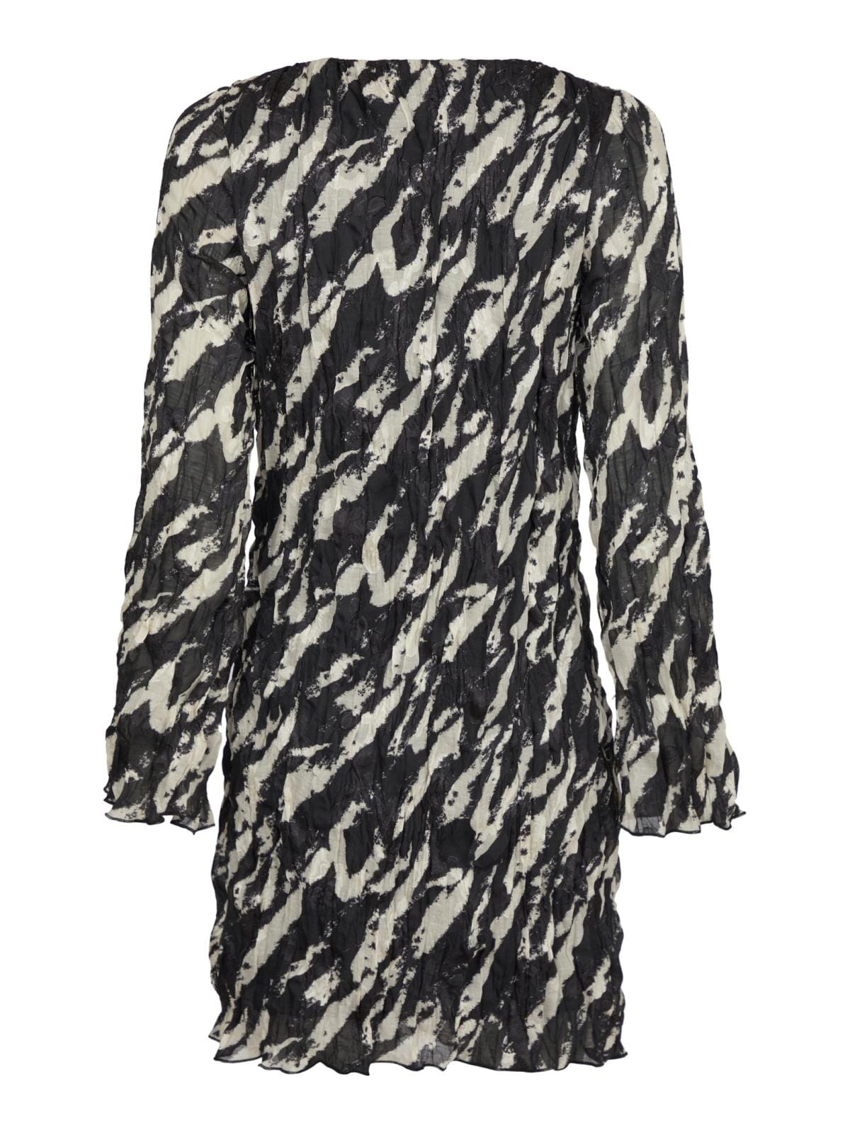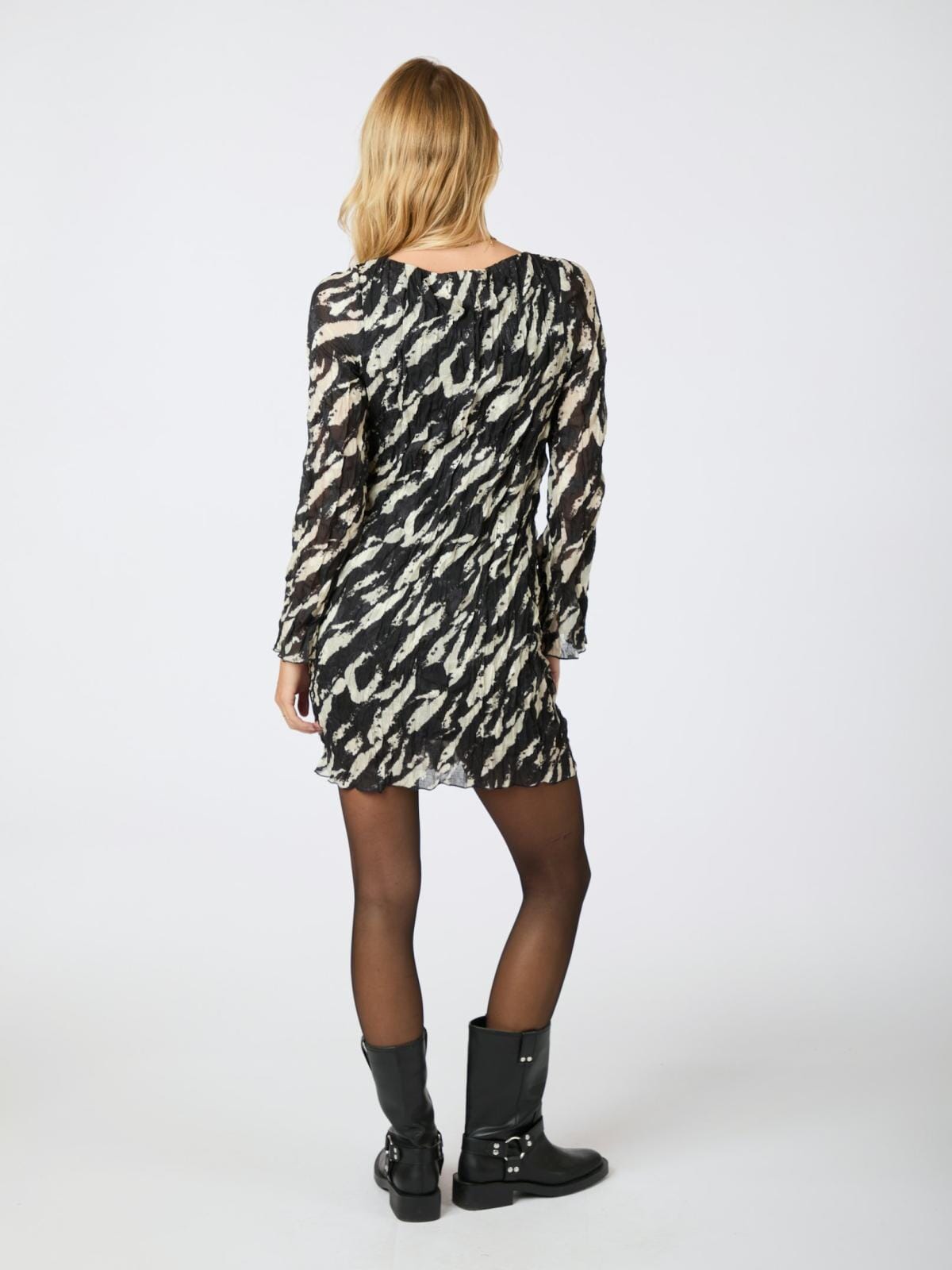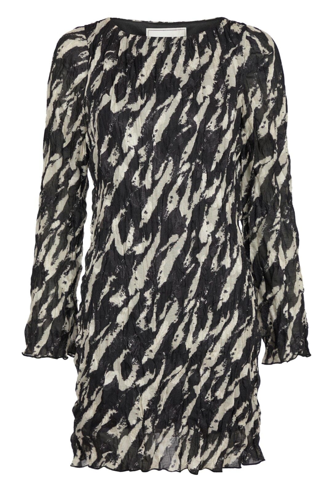Kjole fra Neo Noir i sort og cremefarvet zebramønster. Den har en rynket tekstur, lange ærmer og rund hals. Kjolen når til midt på låret og har en afslappet pasform.
