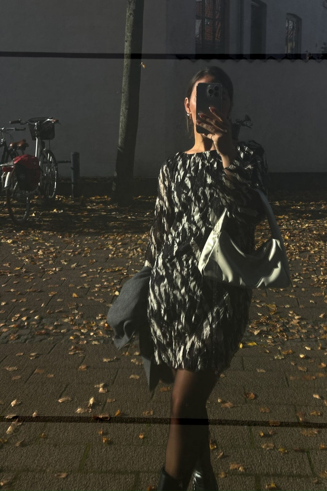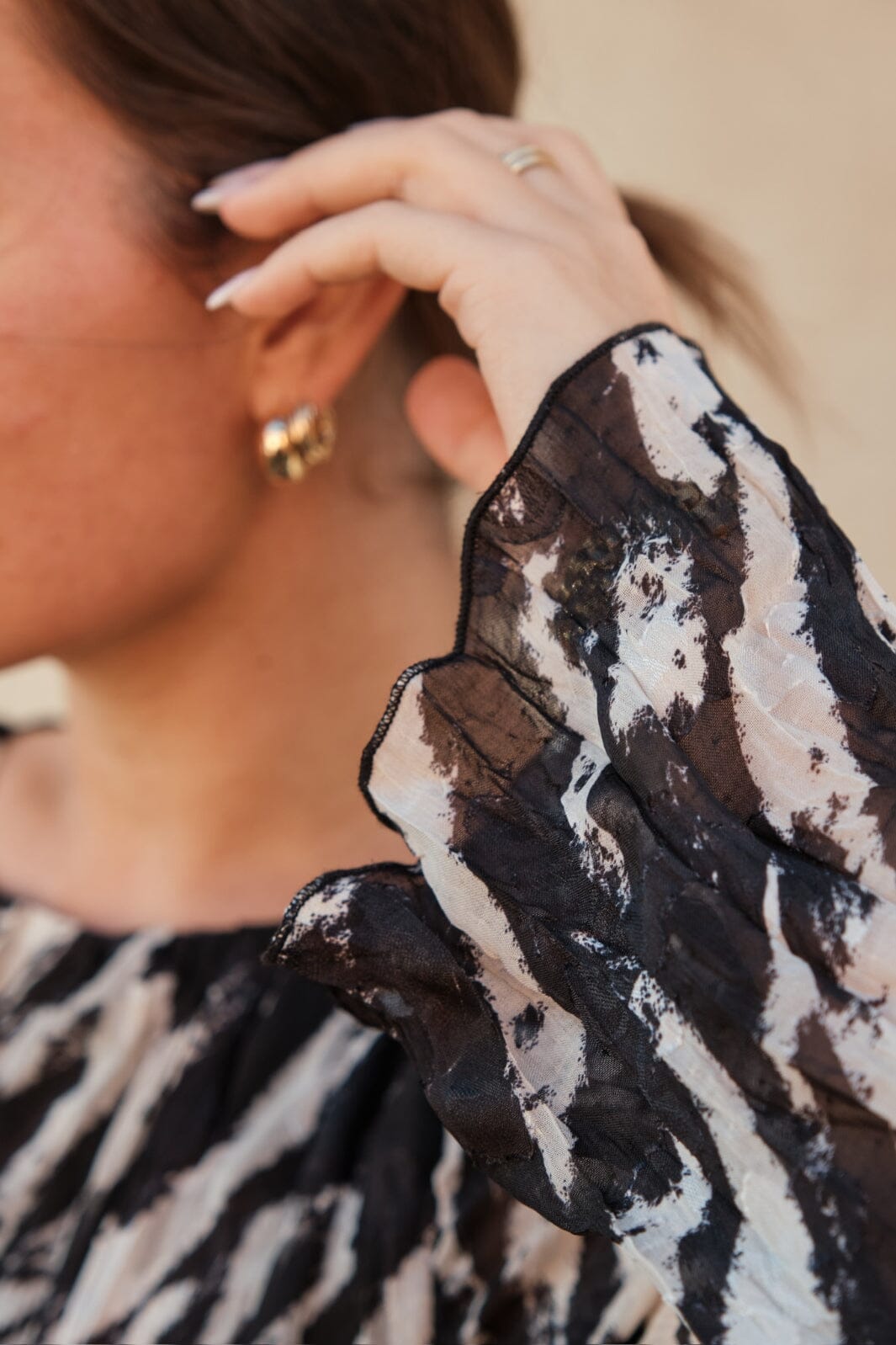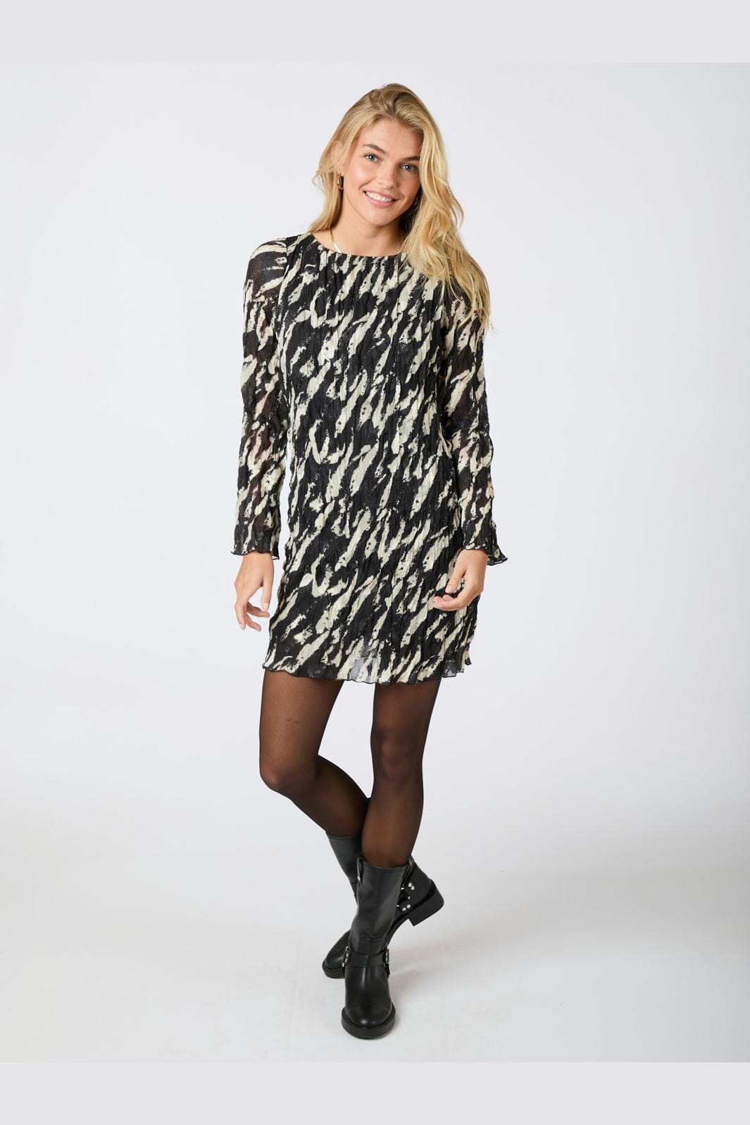 Kjole fra Neo Noir i sort og cremefarvet zebramønster. Den har en rynket tekstur, lange ærmer og rund hals. Kjolen når til midt på låret og har en afslappet pasform.
