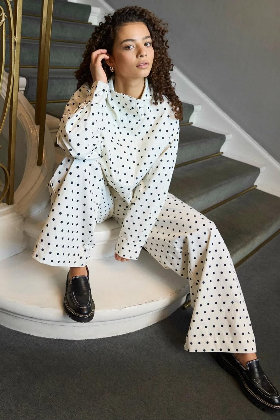 Hvide bukser fra Neo Noir med sorte prikker. Bukserne har høj talje og gulvlang længde med løs pasform og vide ben.