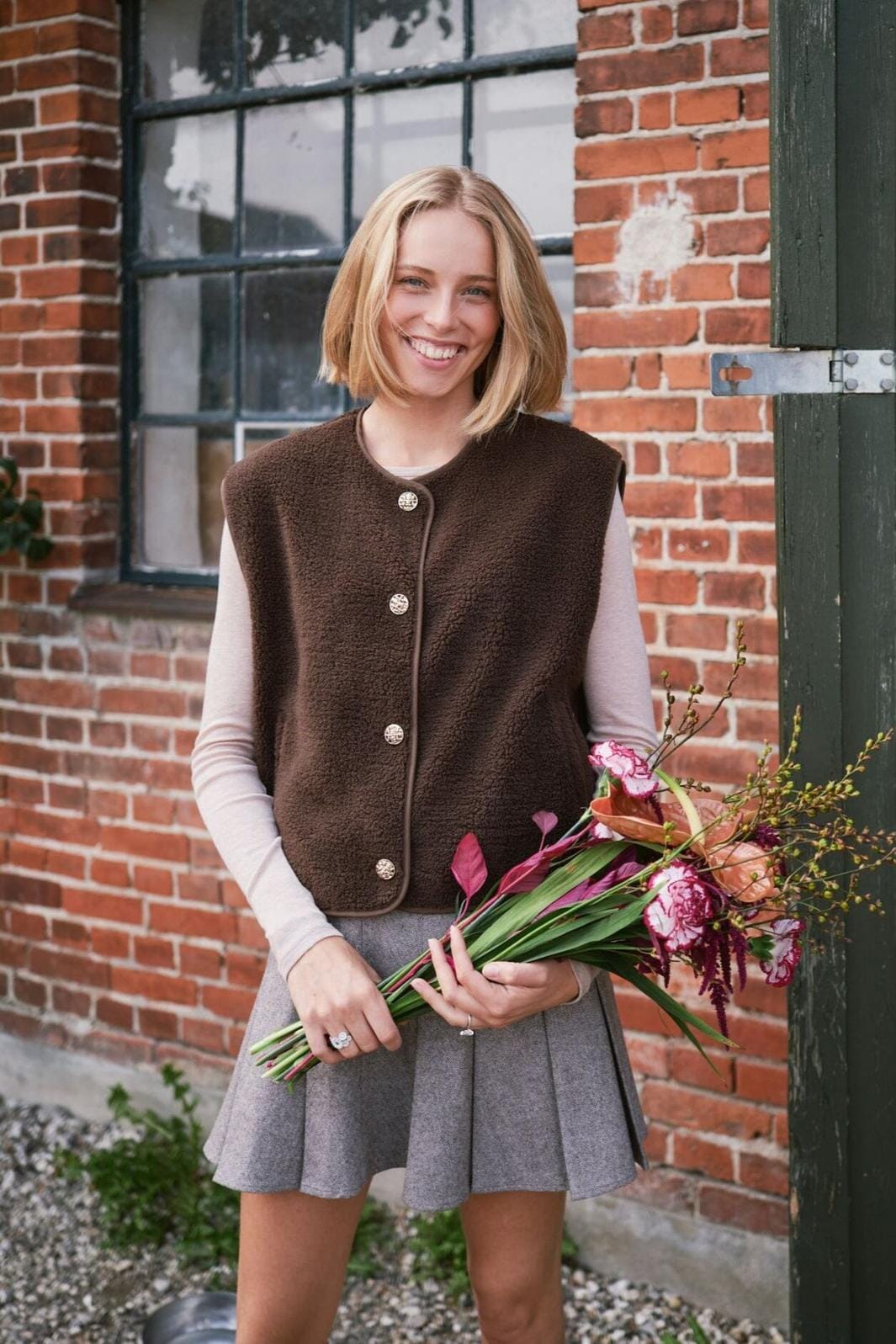 Mørkebrun teddyvest fra Neo Noir med rund halsudskæring. Den bløde og fuzzy teddy-tekstur giver vesten et varmt og indbydende udtryk.