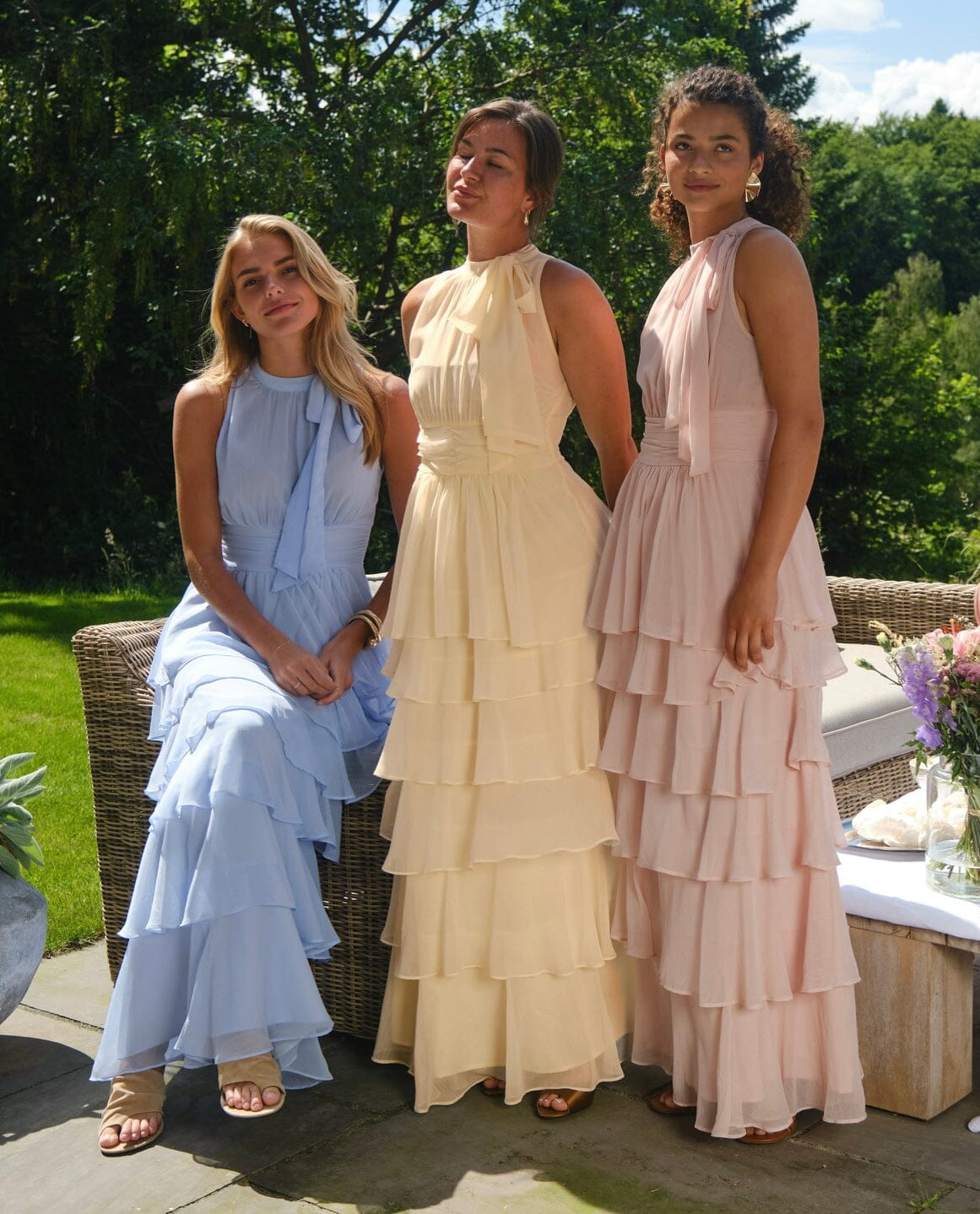 Lang chiffonkjole fra Neo Noir i lyseblå. Kjolen har halterneck-design med bindebånd ved halsen og flere lag af chiffon, der falder i flæser ned ad kjolen.
