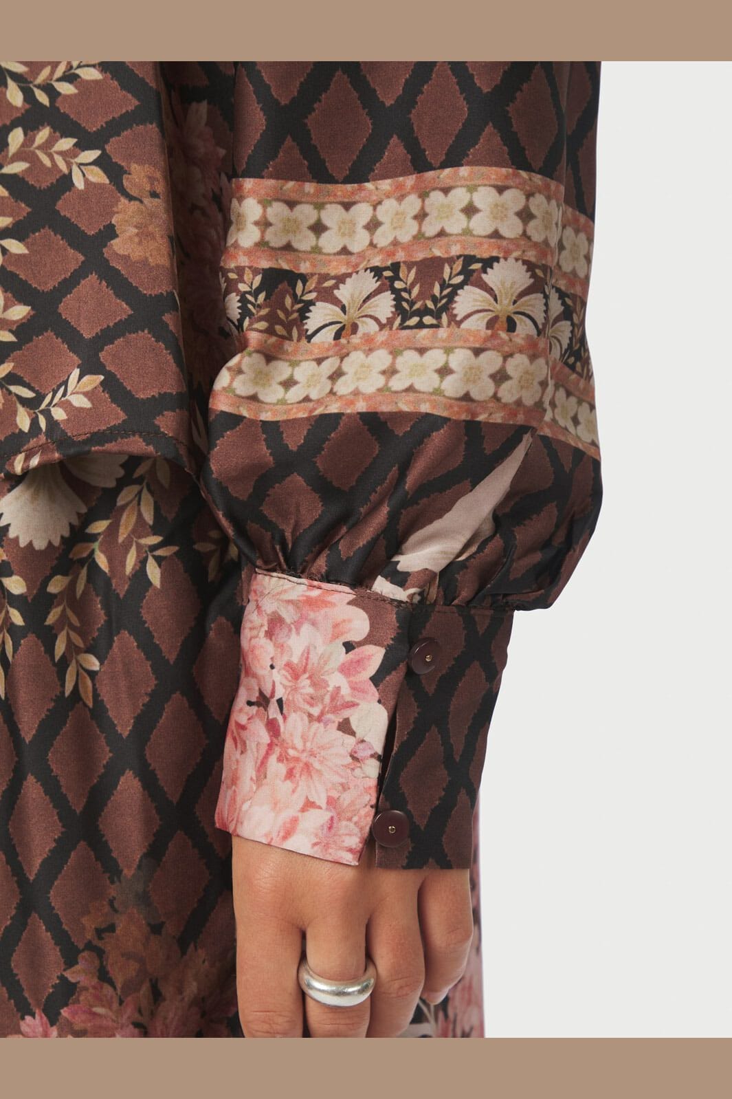 Sort bluse fra Neo Noir med blomsterprint i pink og jordfarver. Blusen har V-udskæring med knaplukning foran og lange ærmer med flæsedetaljer.