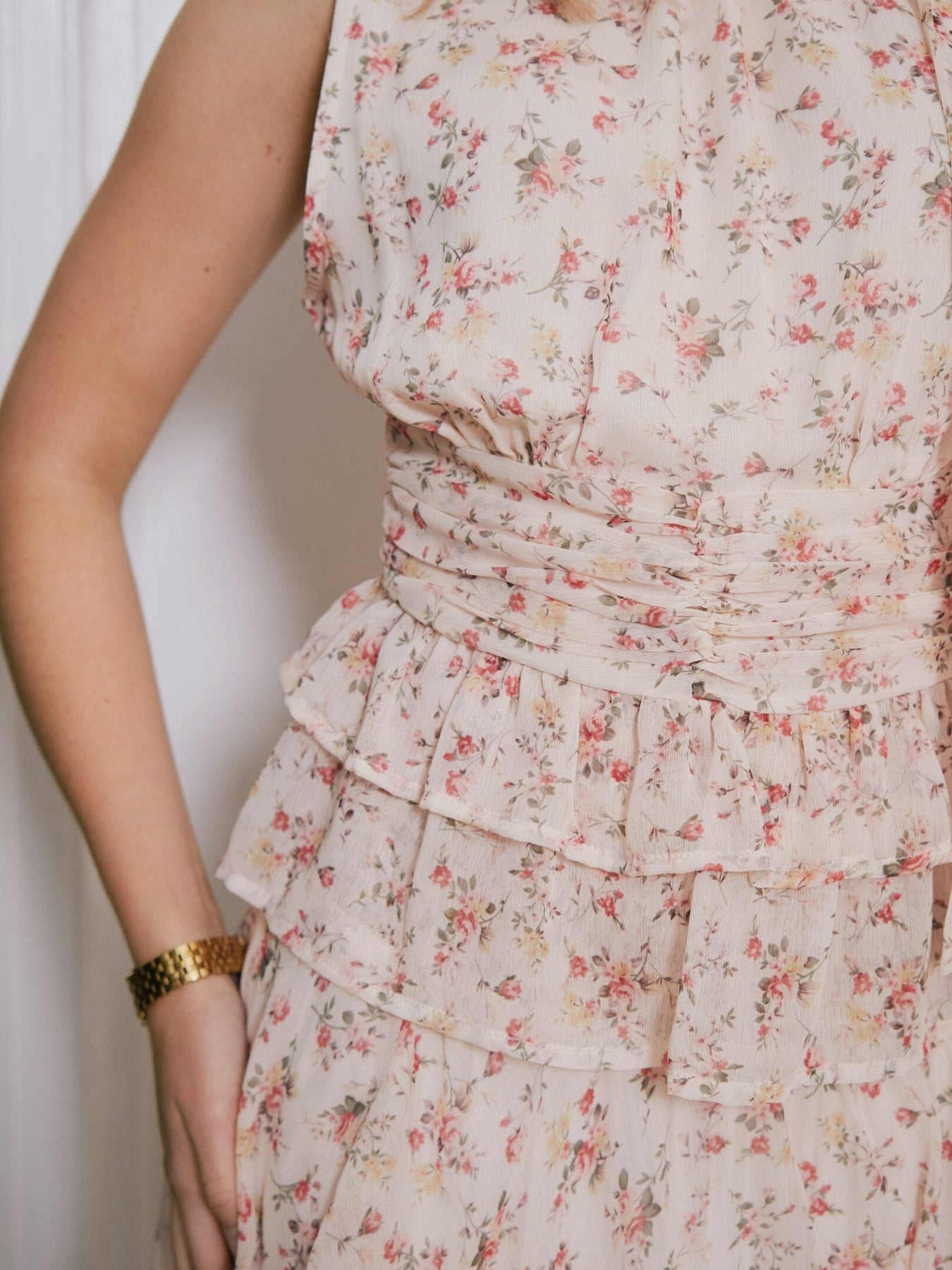 Nederdel fra Neo Noir i en cremefarvet nuance med blomsterprint i lyse toner. Nederdelen har flere lag af stof med flæser og rynker.