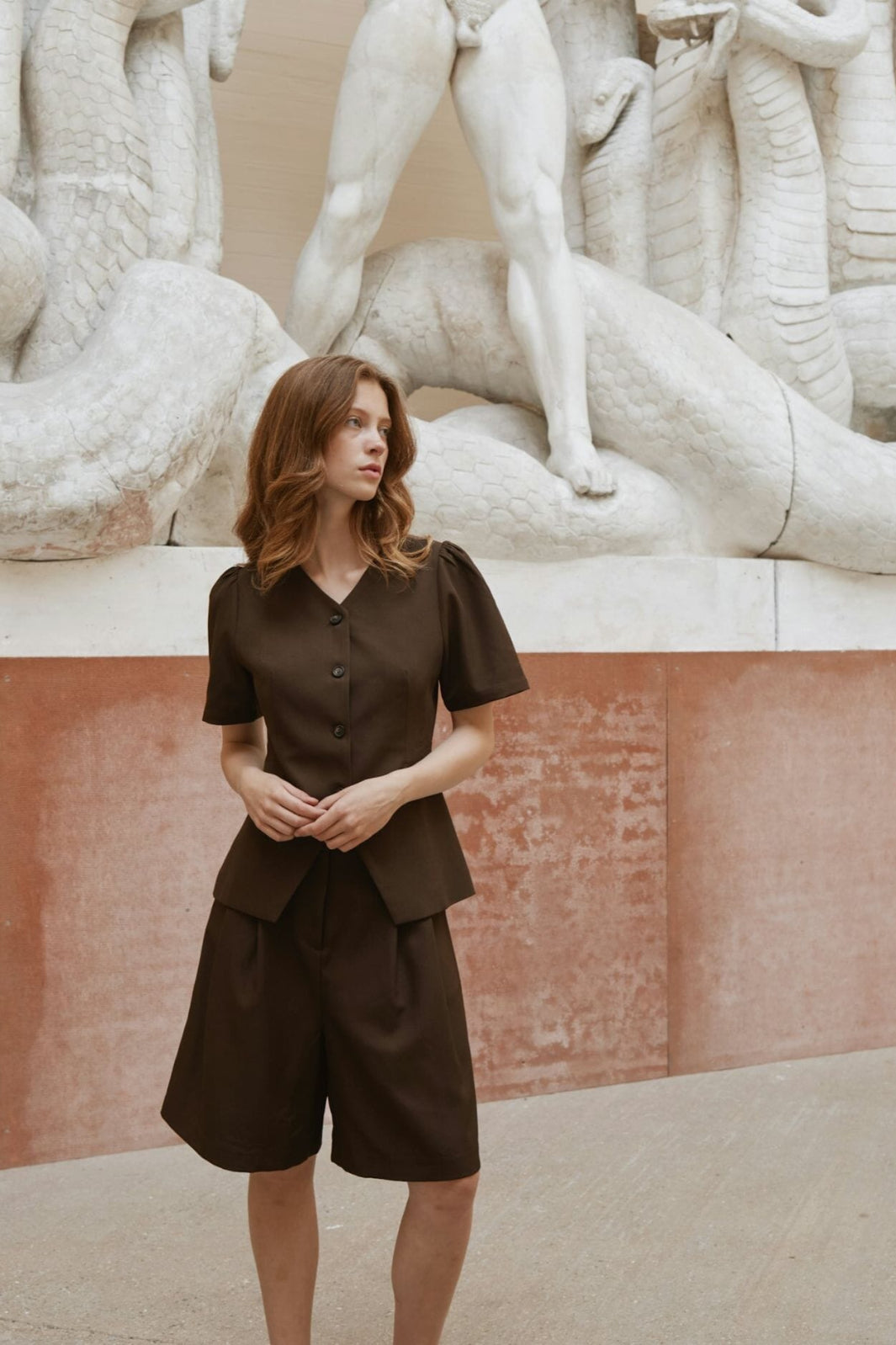 Mørkebrune shorts fra Neo Noir med brede ben og læg foran. Shortsene har en høj talje og en løs pasform, der giver god bevægelsesfrihed.