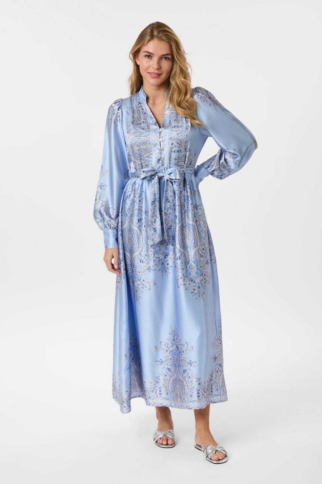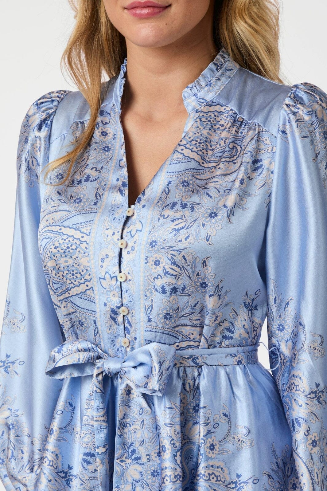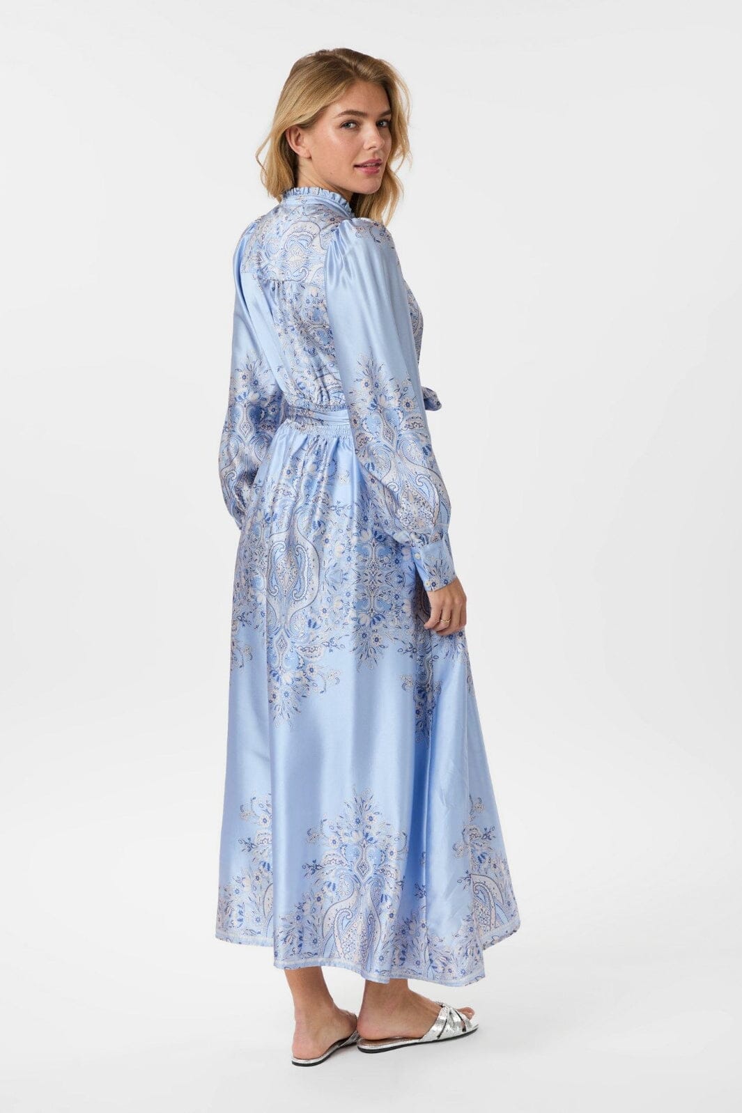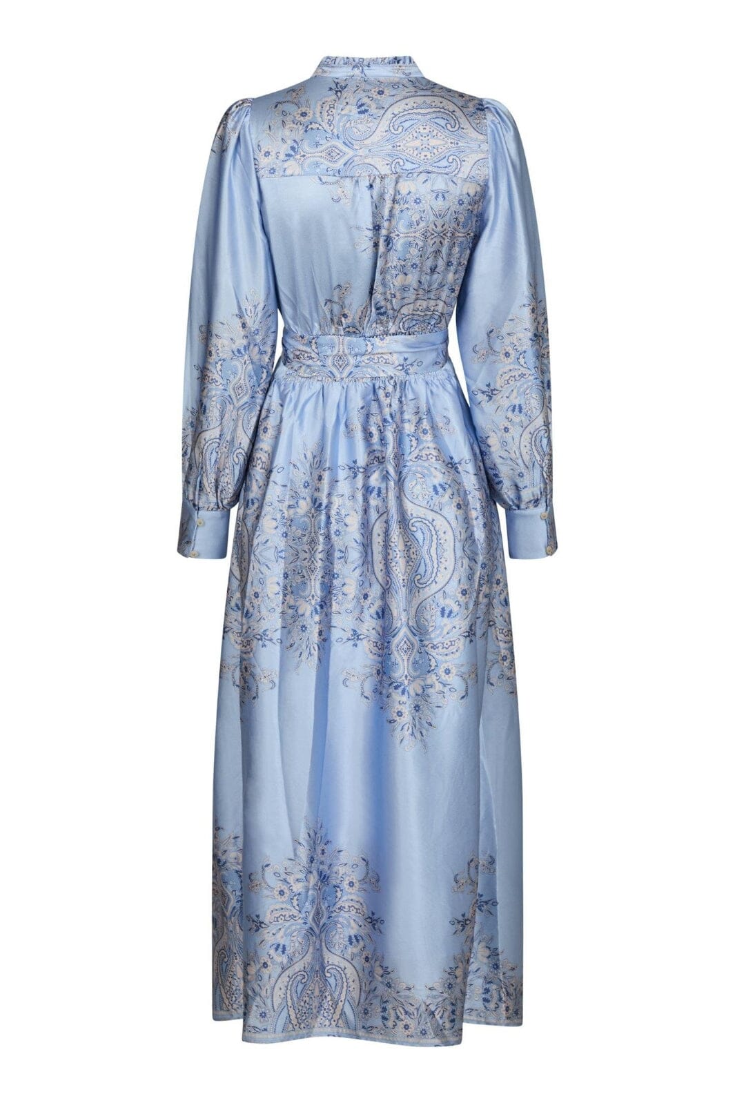 Kjole fra Neo Noir i lyseblå med paisley-mønster. Den har v-hals, betrukne knapper foran og lange ærmer med pufdetaljer. Bindebåndet i taljen giver mulighed for at justere pasformen.