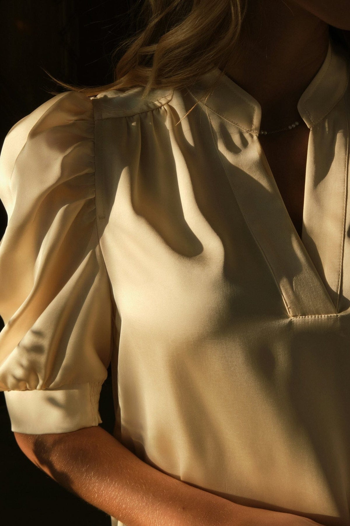Bluse fra Neo Noir i lys gul, lavet af mat satin. Blusen passer til både formelle lejligheder, hverdagen og festlige arrangementer.