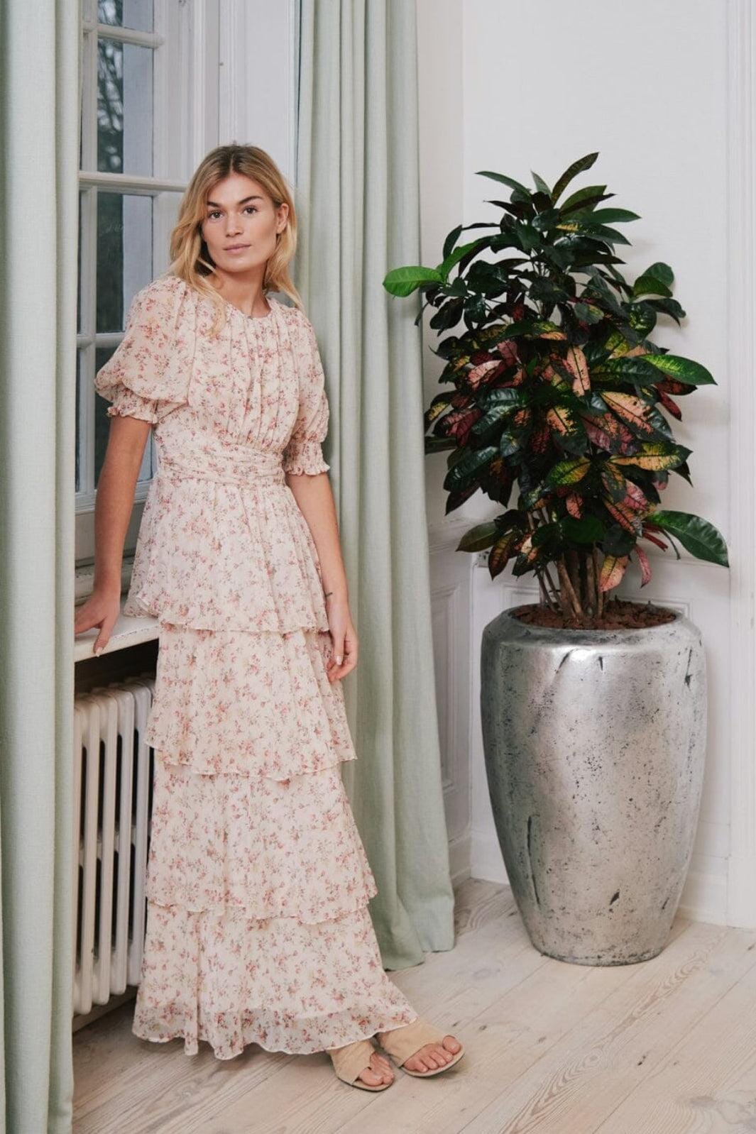 Kjole fra Neo Noir i creme med blomsterprint. Kjolen er lavet af polyester og har en ankel-lang længde med flere lag i underdelen.
