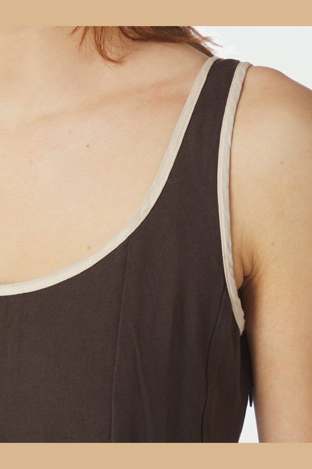 Mørkebrun kjole fra Neo Noir, lavet af en blanding af bomuld og hør. Kjolen har stropper og en firkantet halsudskæring.
