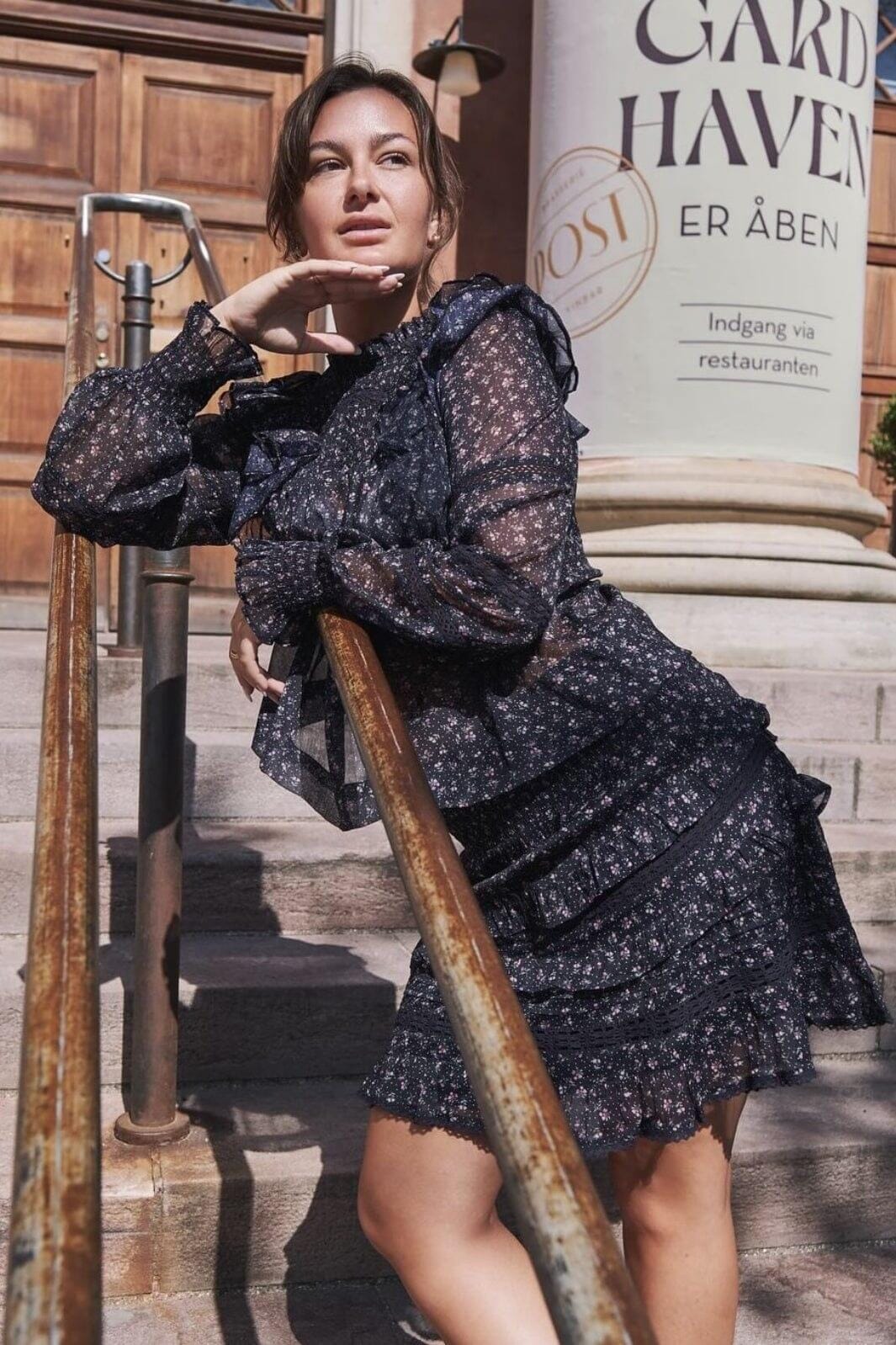 Sort bluse med blomstermønster fra Neo Noir. Blusen har en løs pasform med høj hals og flæsedetaljer. Stoffet er let gennemsigtigt med et fint blomstermønster.