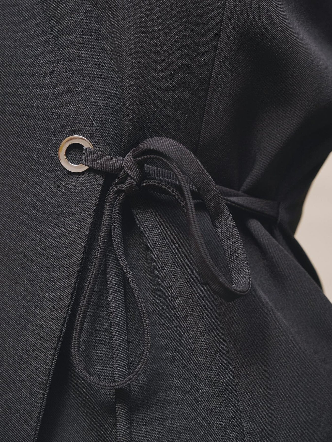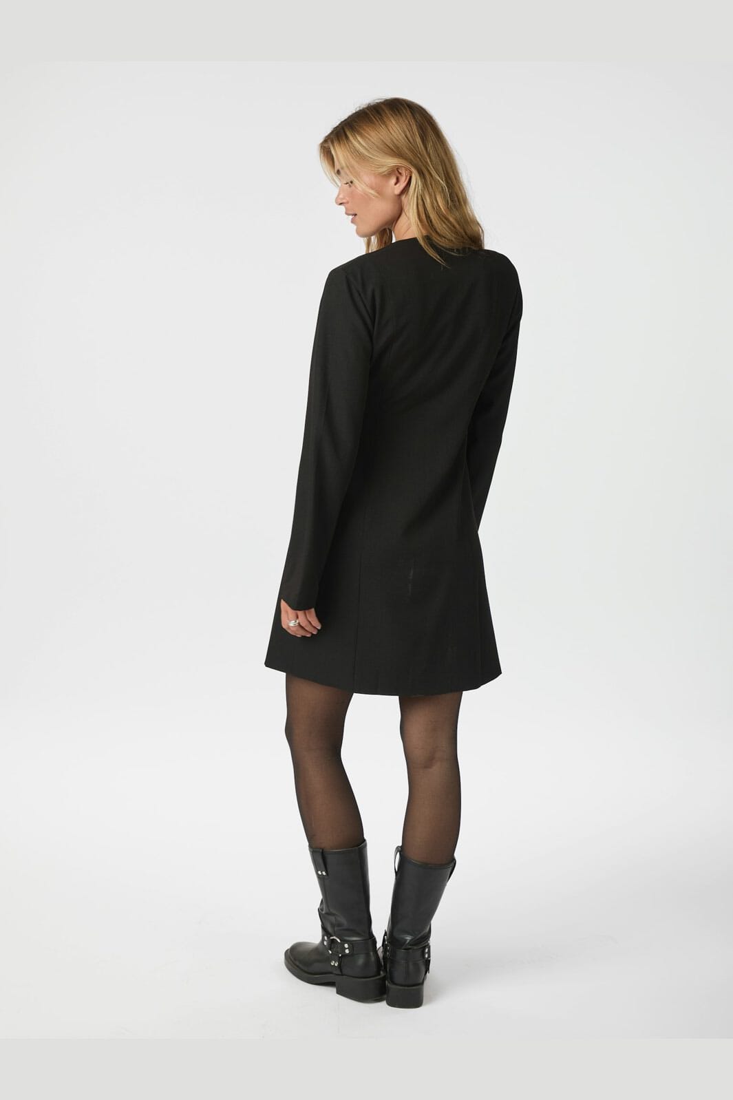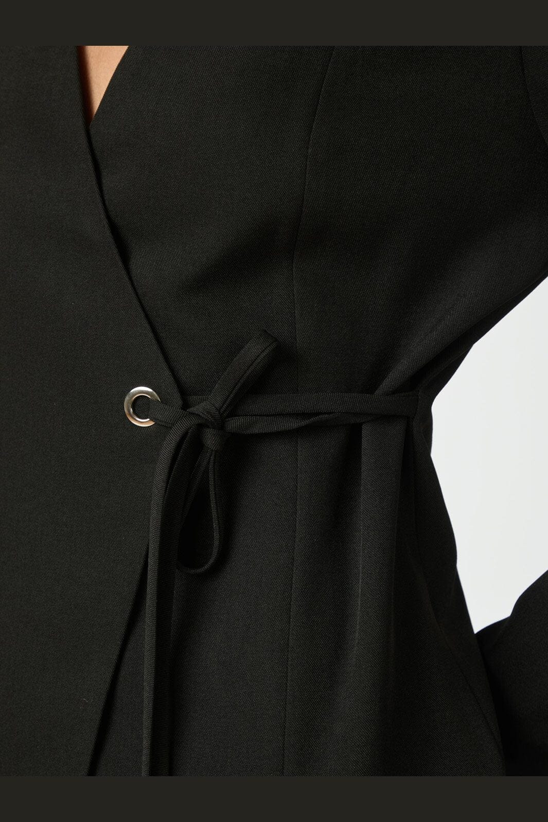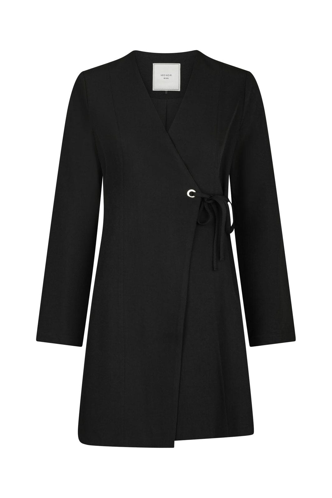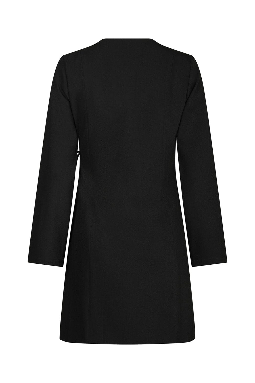 Sort slå-om-kjole fra Neo Noir med V-halsudskæring og 3/4 ærmer. Kjolen har snøredetaljer med metalring i siden, der giver mulighed for at justere pasformen.