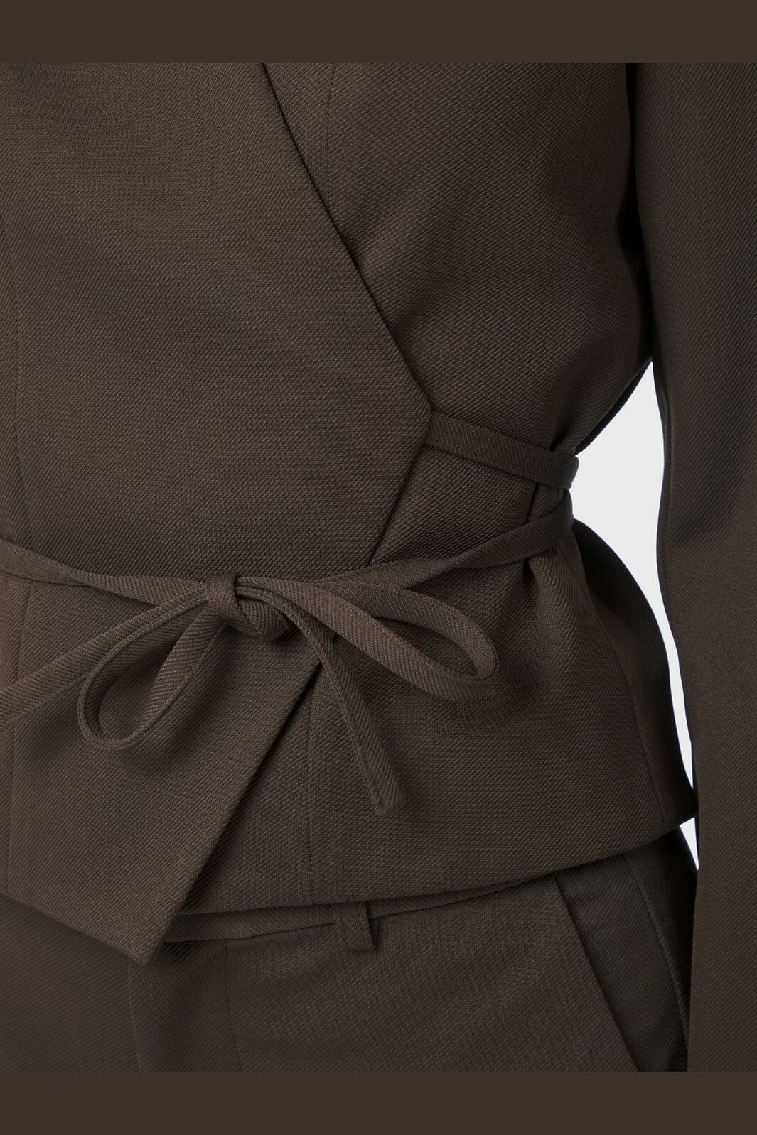 Mørkebrun bluse fra Neo Noir med slå-om-design. Blusen har V-udskæring og lange ærmer. Bindebåndet i taljen giver mulighed for at tilpasse pasformen.