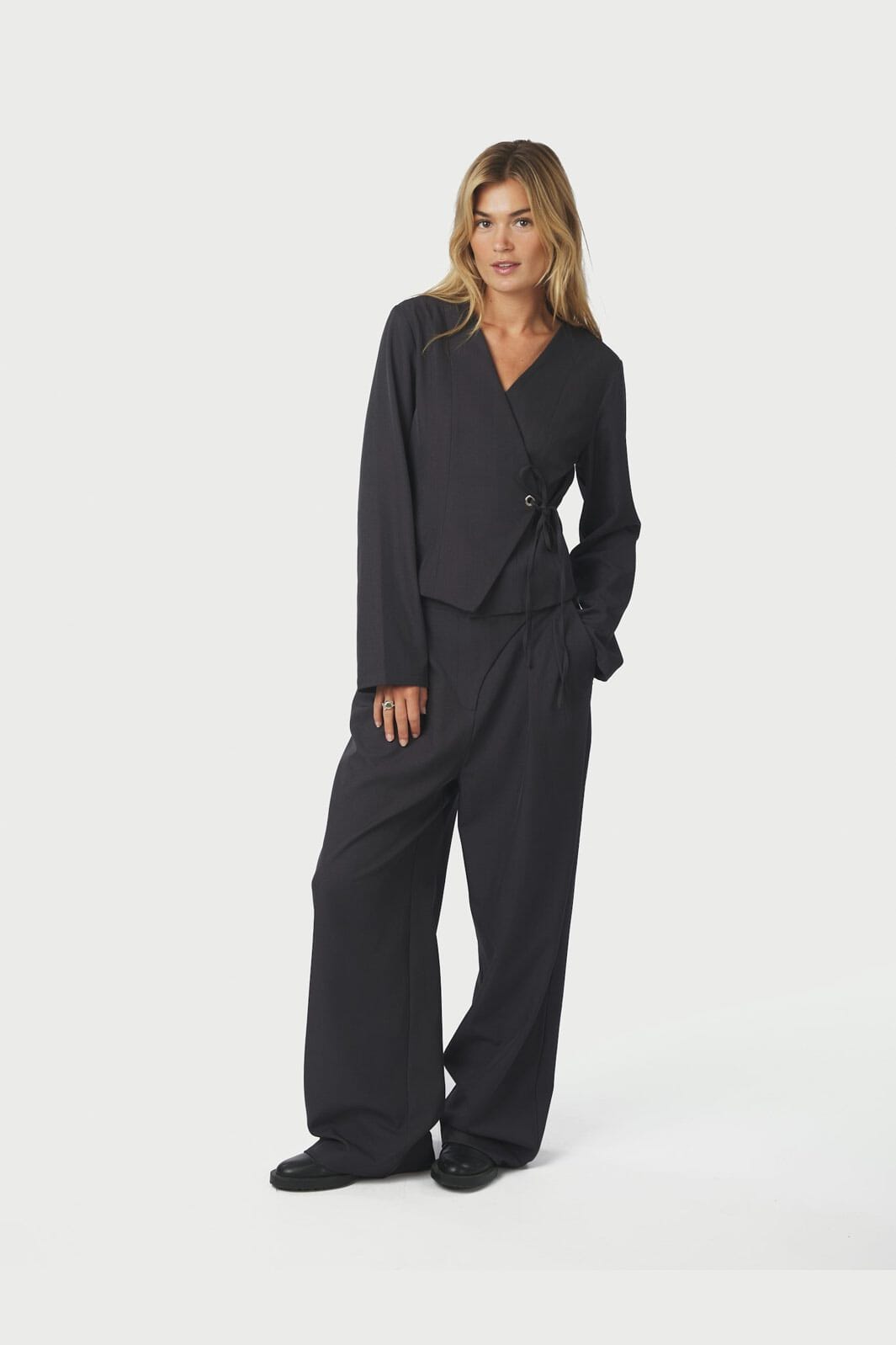 Mørkegrå bluse fra Neo Noir med slå-om-design. Blusen har en V-halsudskæring og lange ærmer. En metalring og bindebånd i siden giver mulighed for at justere pasformen.