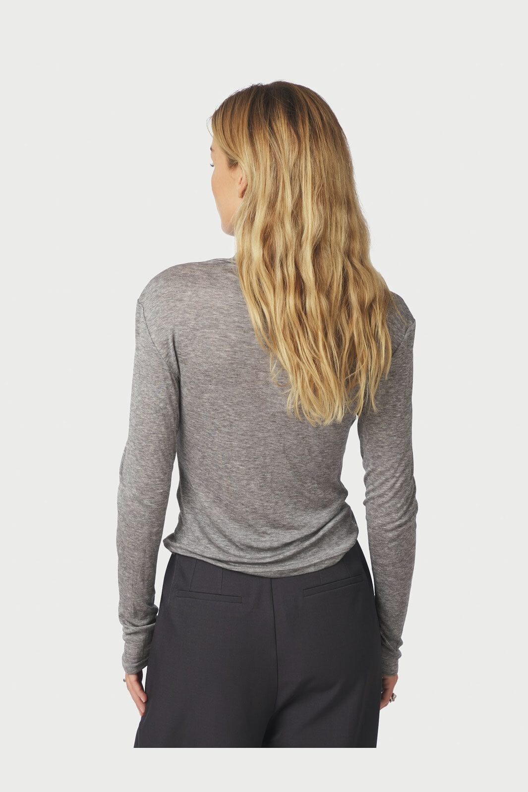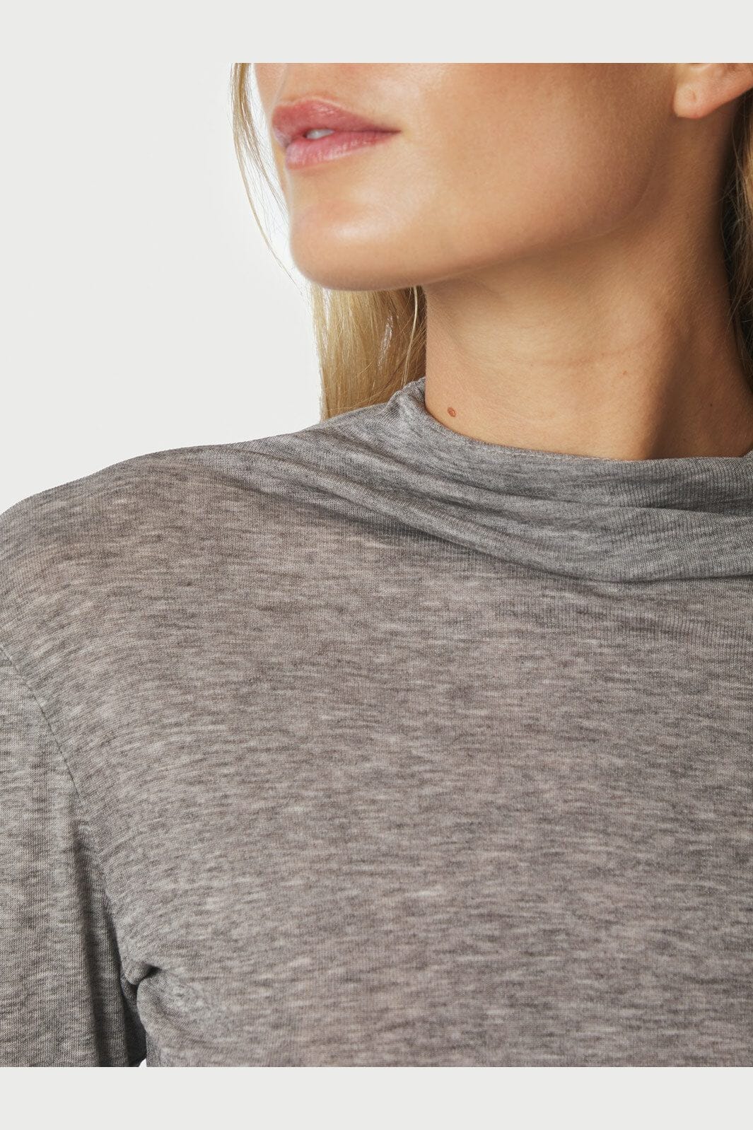 Grå ribstrikket bluse fra Neo Noir med høj hals og tætsiddende pasform. Blusen har en meleret overflade og er fremstillet i en blød blanding af lyocell og uld.