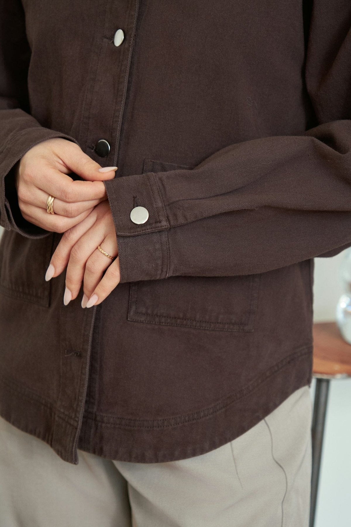 Mørkebrun jakke fra Neo Noir i kanvasmateriale. Jakken har en afslappet pasform med knapper foran og to brystlommer med klap. Den dekorative syning giver jakken et rustikt præg.