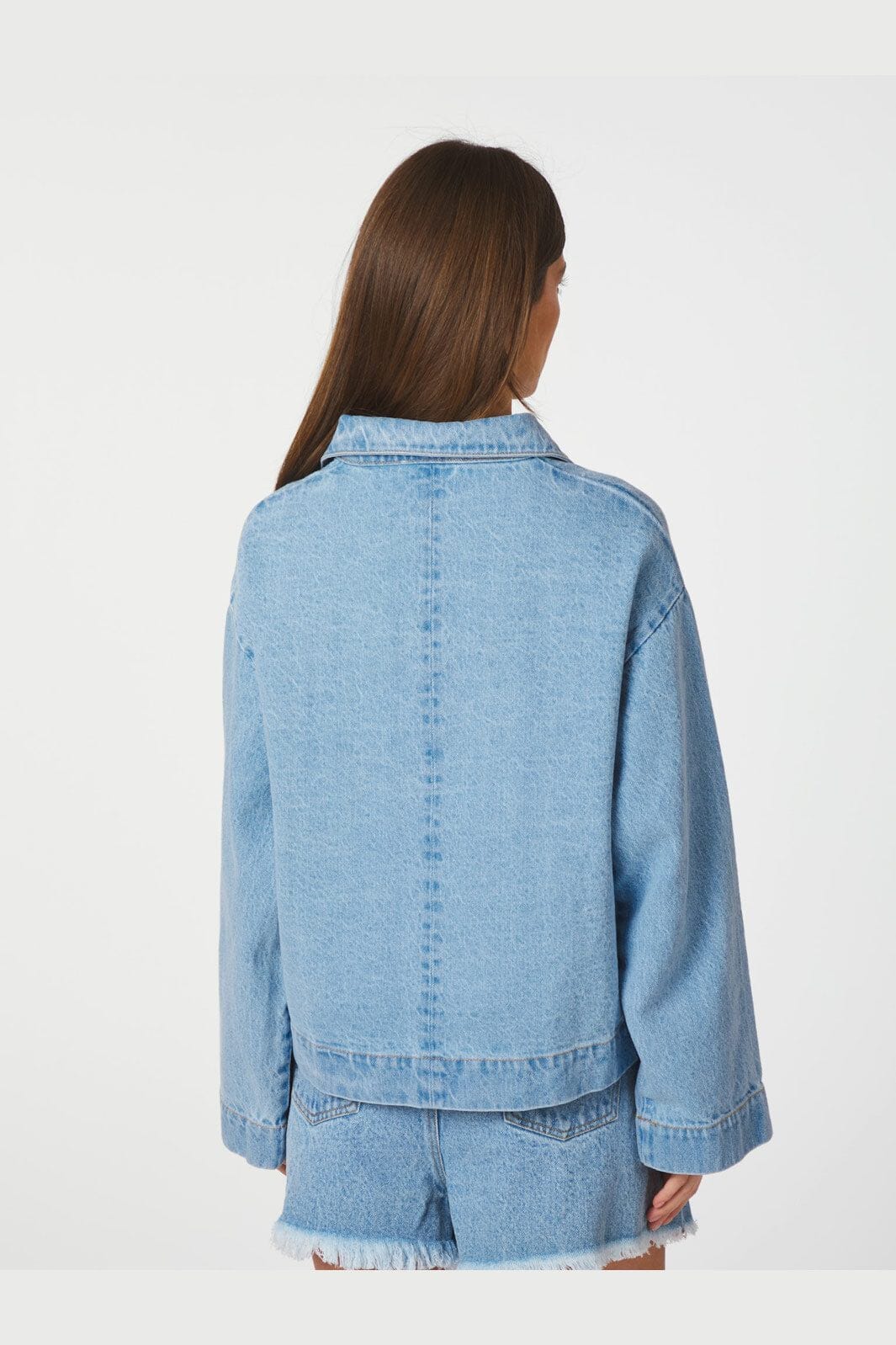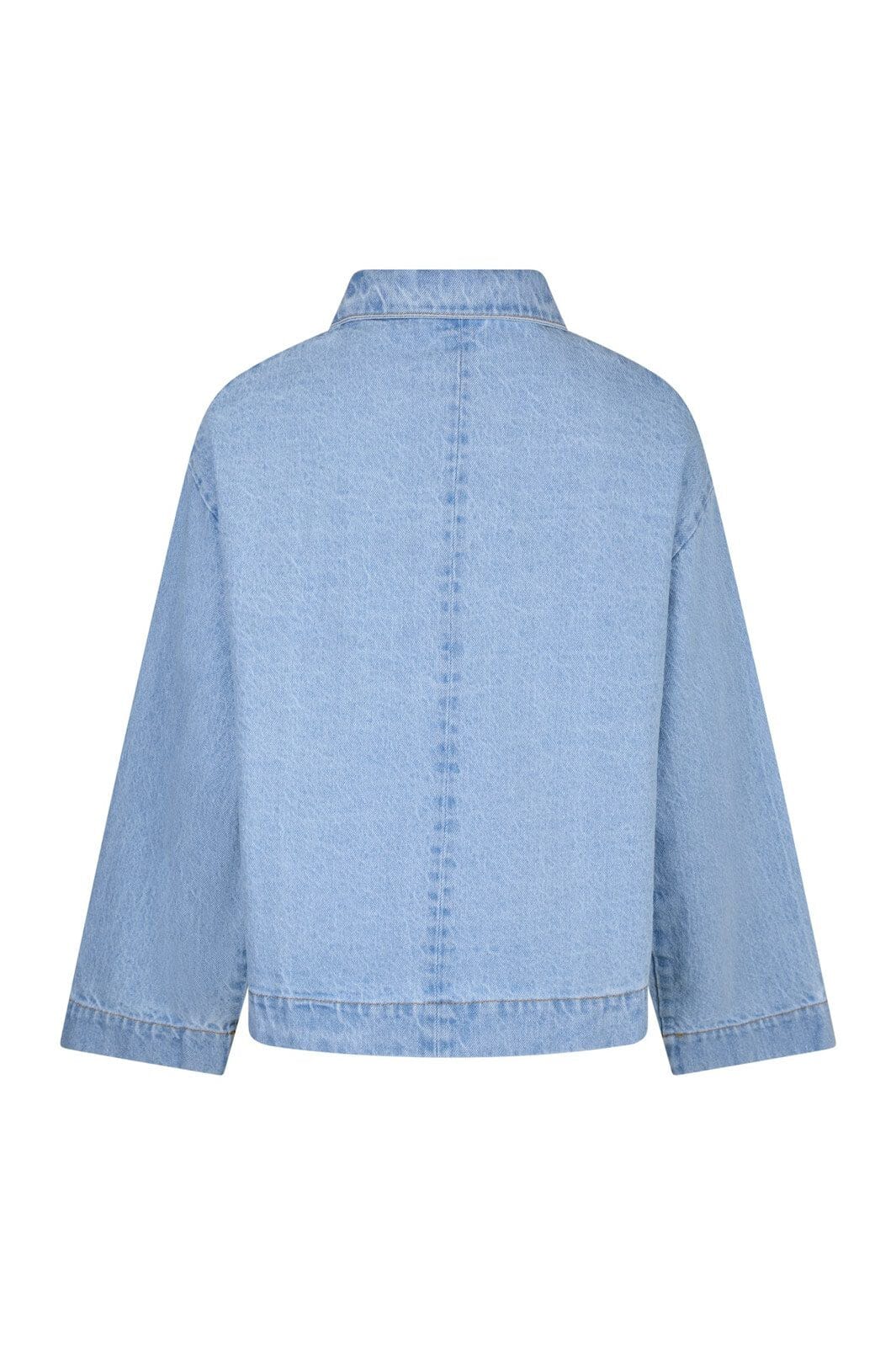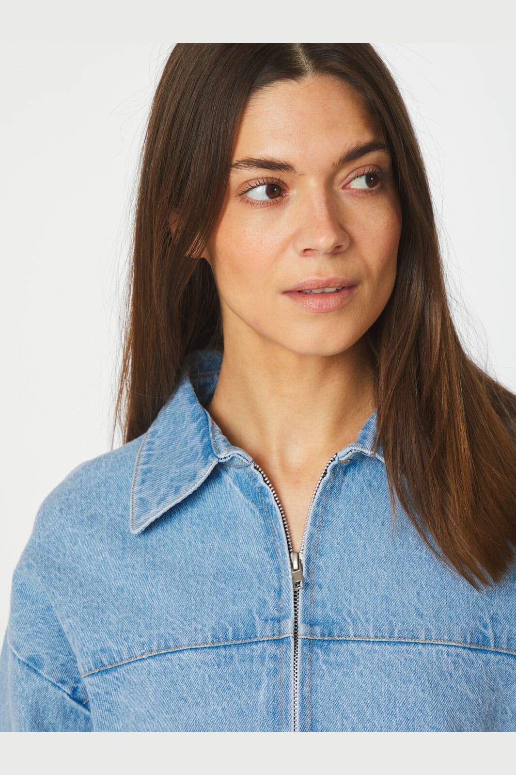 Denimjakke fra Neo Noir i lys blå. En oversize-model med flipkrave og lynlås foran. Jakken har praktiske sidelommer og er fremstillet i denimkvalitet.