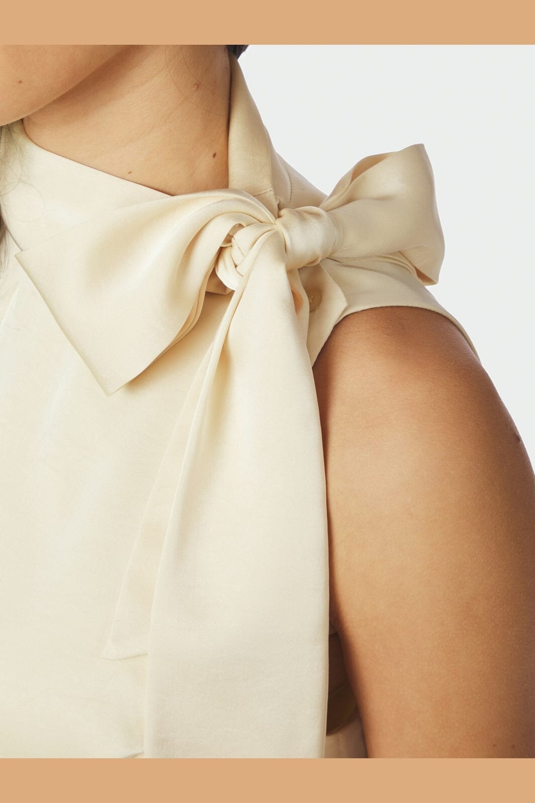 Sateen-top fra Neo Noir i lys gul farve. Toppen er lavet af satin og har en høj halsudskæring med sløjfedetalje på den ene skulder.