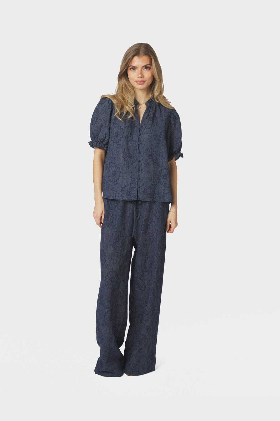 Mørkeblå bluse fra Neo Noir med et blomstret og stribet mønster. Blusen har korte pufærmer, V-hals og knappelukning foran.