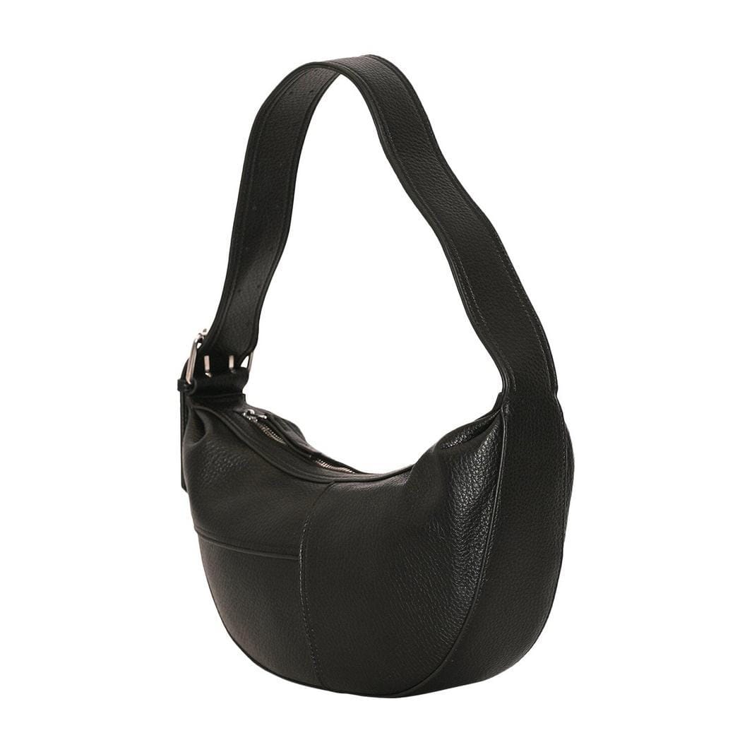 Sort skuldertaske fra Noella med buet form og pebret overflade. Tasken har en rummelig indvendig sektion og en praktisk lynlåslukning i toppen.
