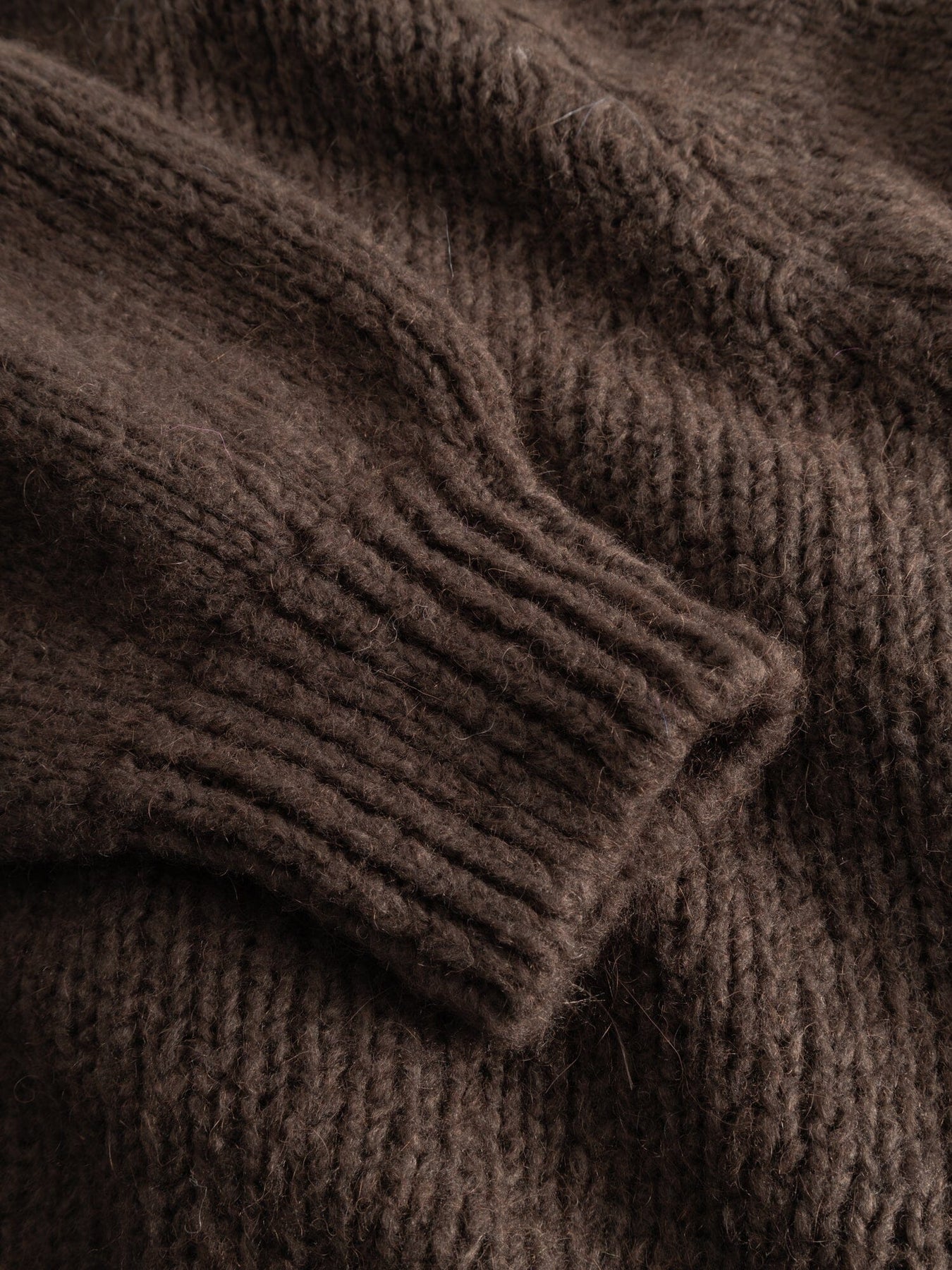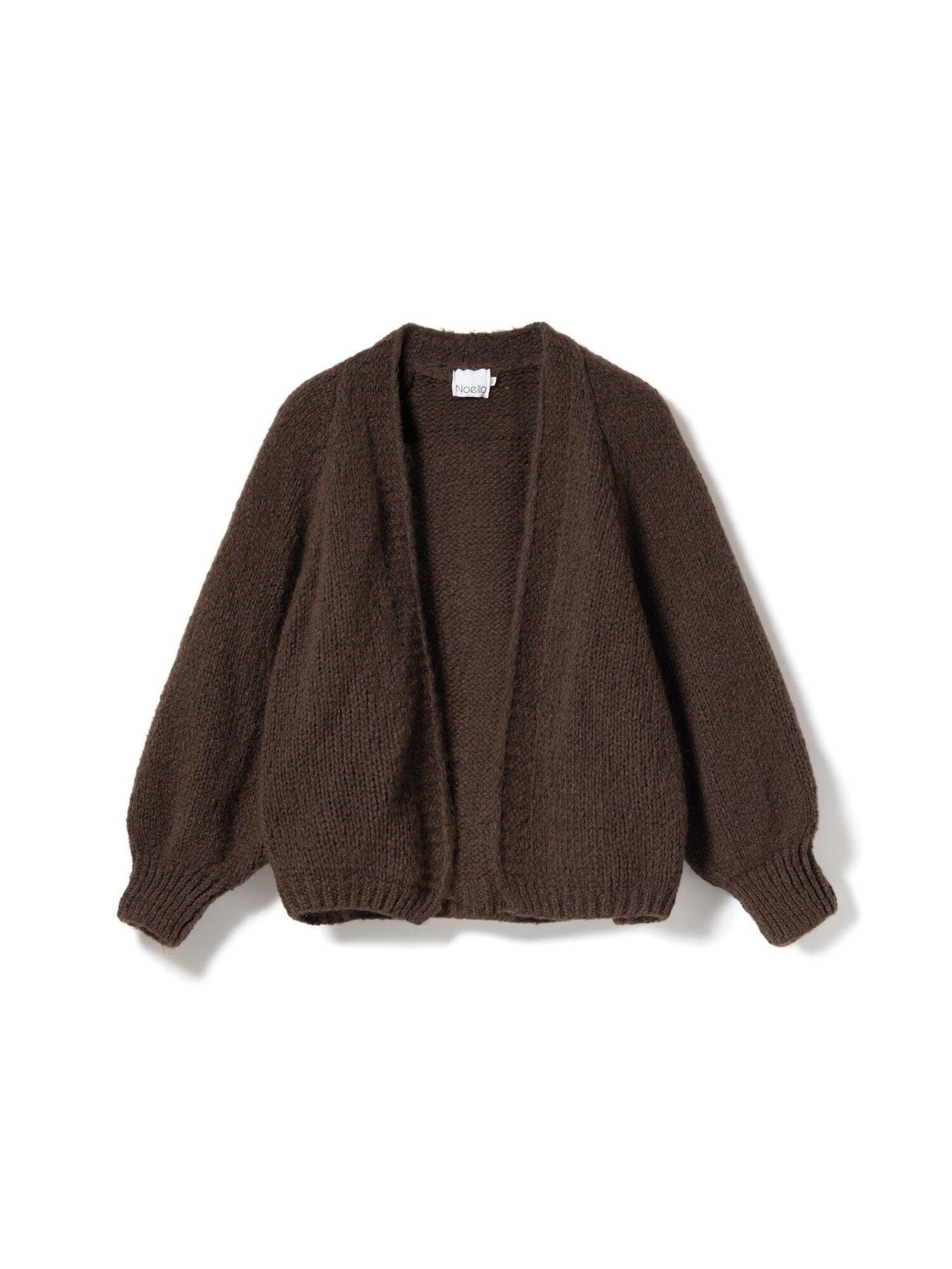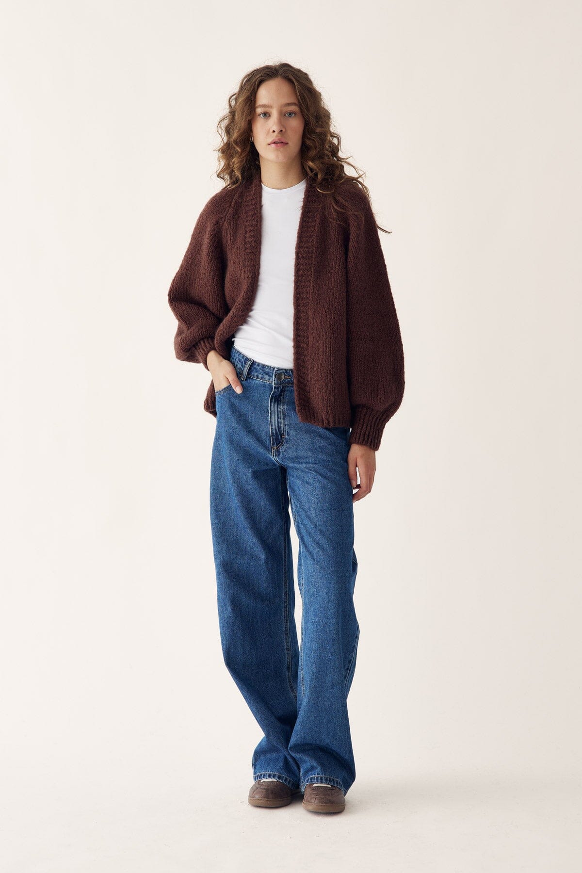 Mørkebrun cardigan fra Noella i en blød materialeblanding med mohair og uld. Den løse pasform og de lange ærmer giver god plads til lag-på-lag-styling.