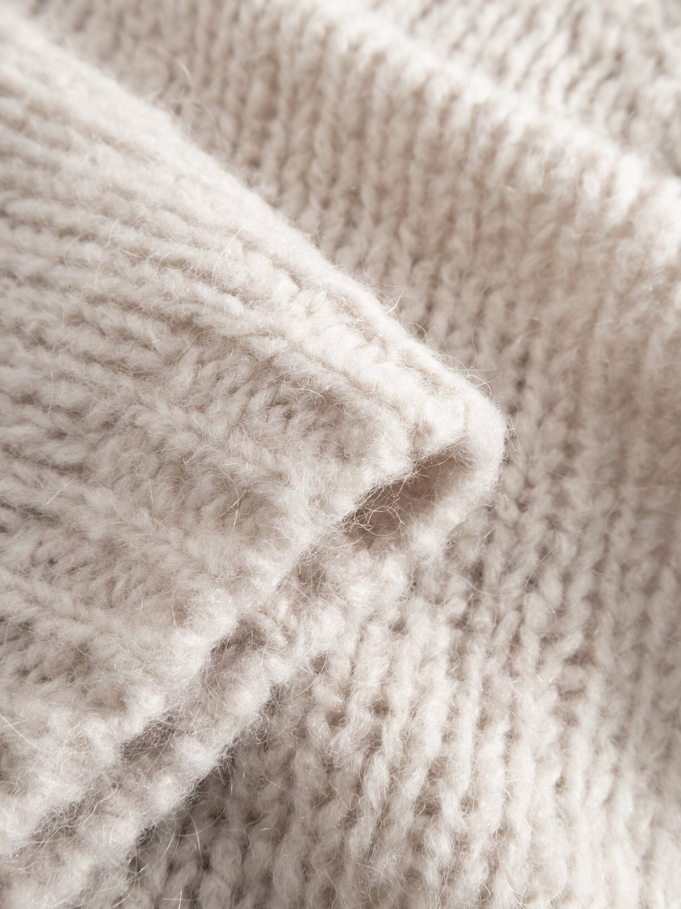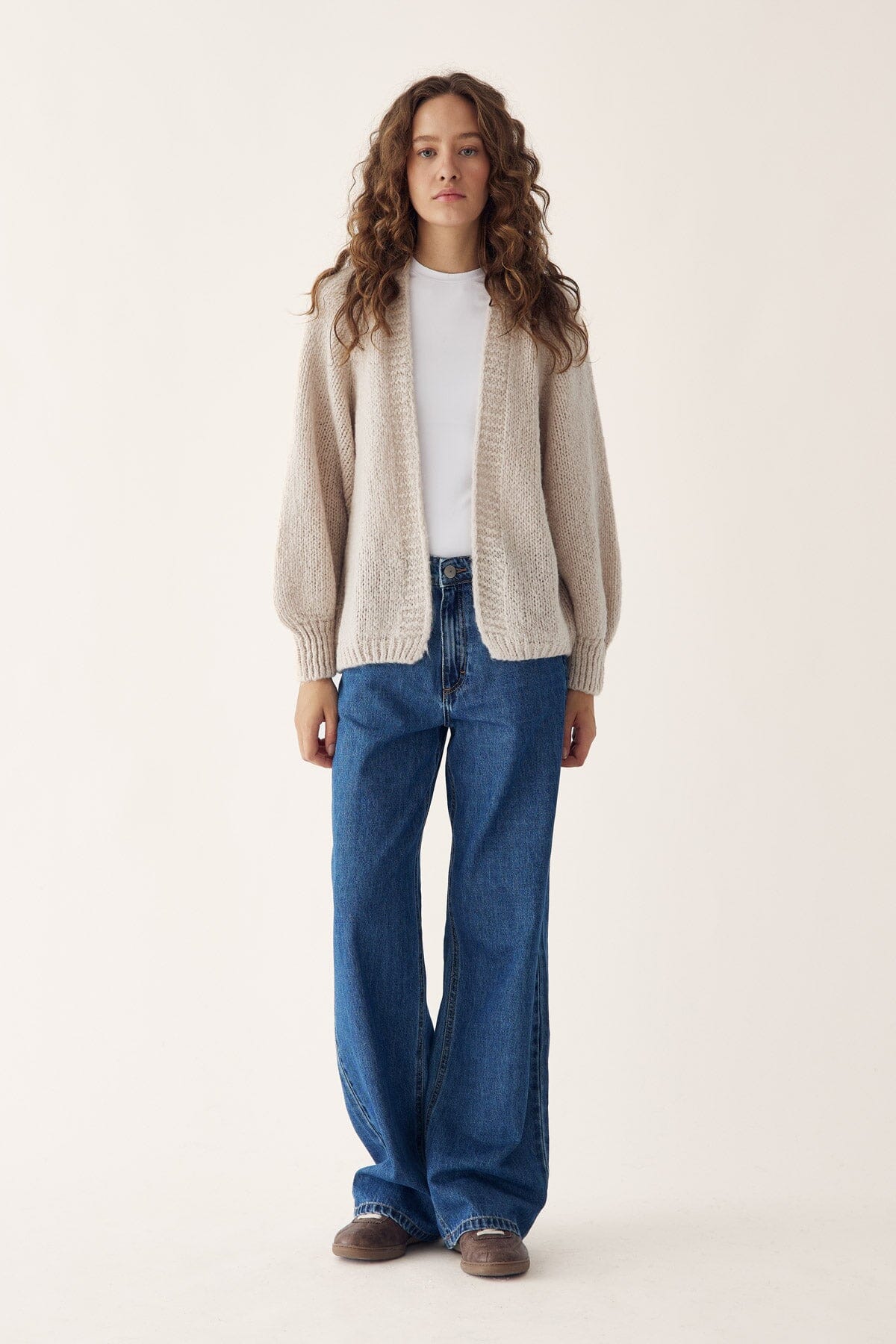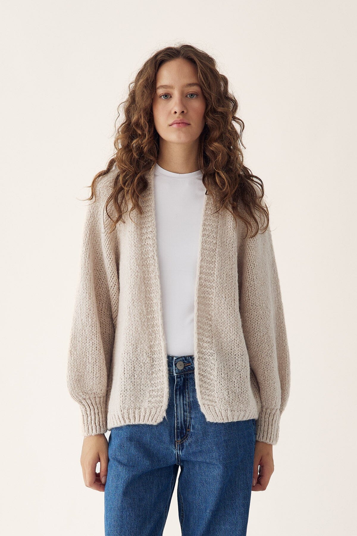 Sandfarvet cardigan fra Noella med chunky strik og V-hals. Den tykke strik giver både varme og karakter, mens den løse pasform skaber en afslappet silhuet.