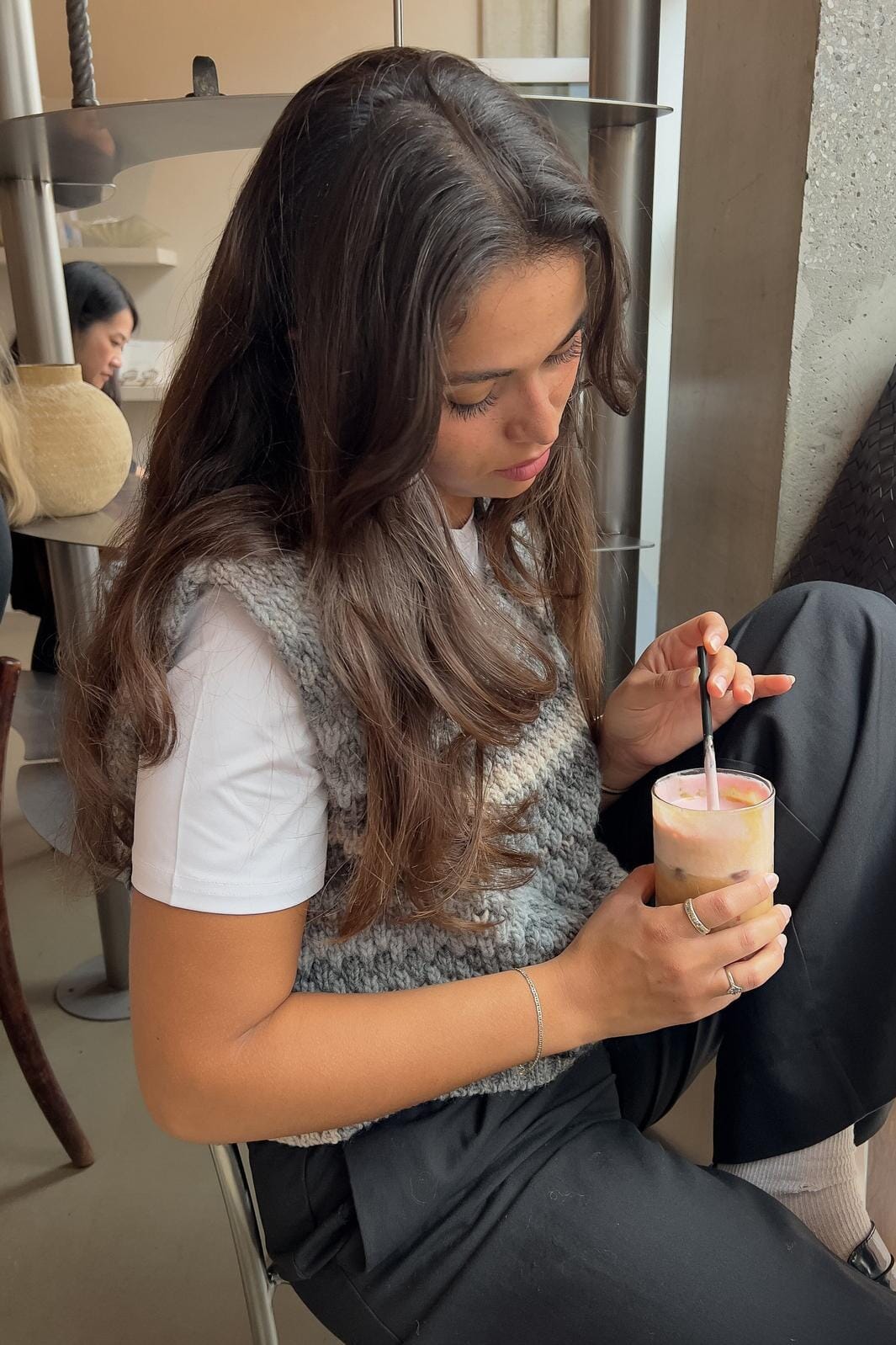 Strikket vest fra Noella i lysegrå og beige nuancer. Vesten har en chunky strikstil med et meleret stribemønster.