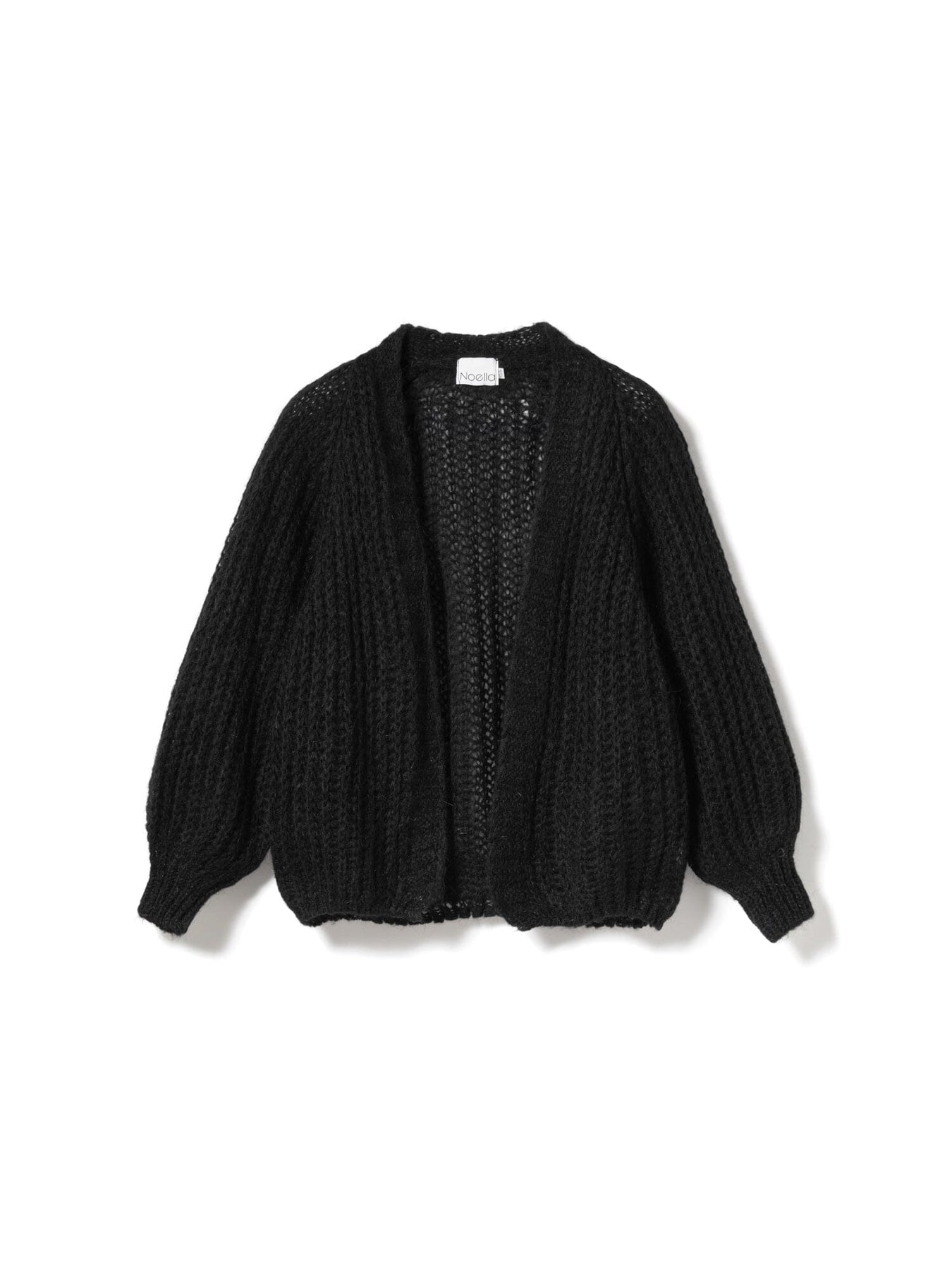 Sort cardigan fra Noella med strikket tekstur og løs pasform. De let puffede ærmer og den åbne front giver cardiganen et enkelt og afslappet udtryk.