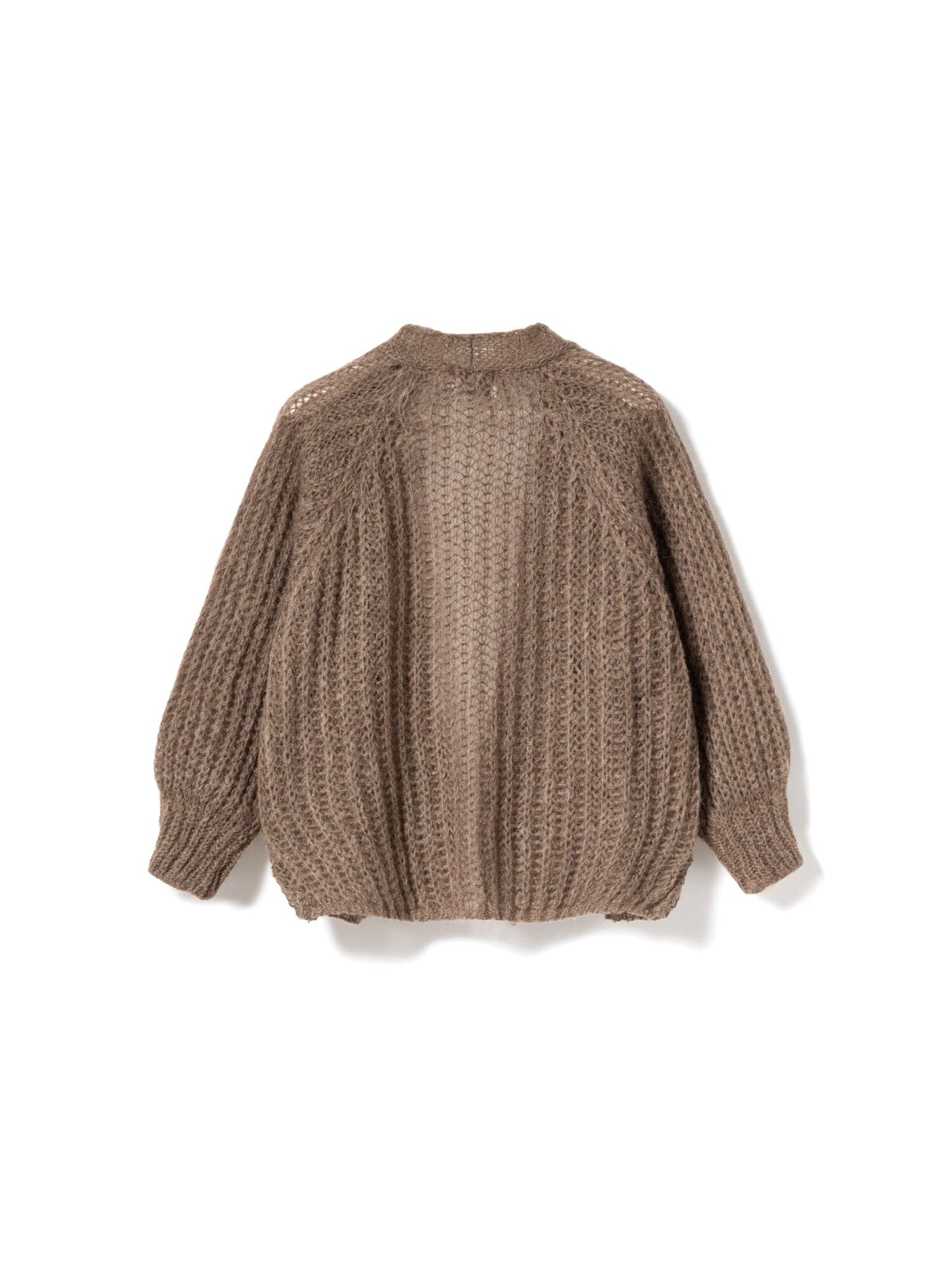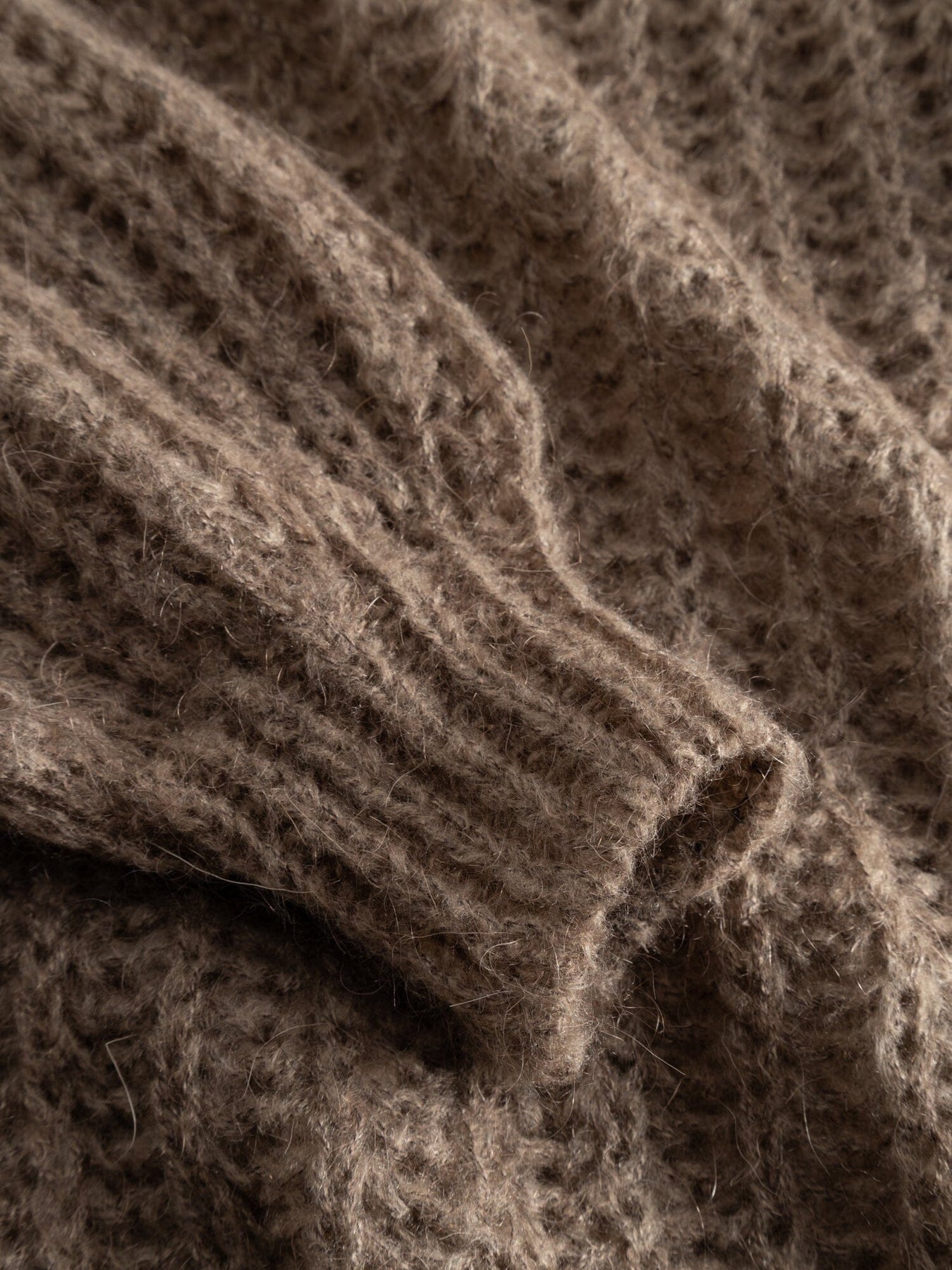 Brun cardigan fra Noella med løs pasform og lange ærmer. Strikket i en blød blanding af mohair, akryl og nylon med en luftig struktur.