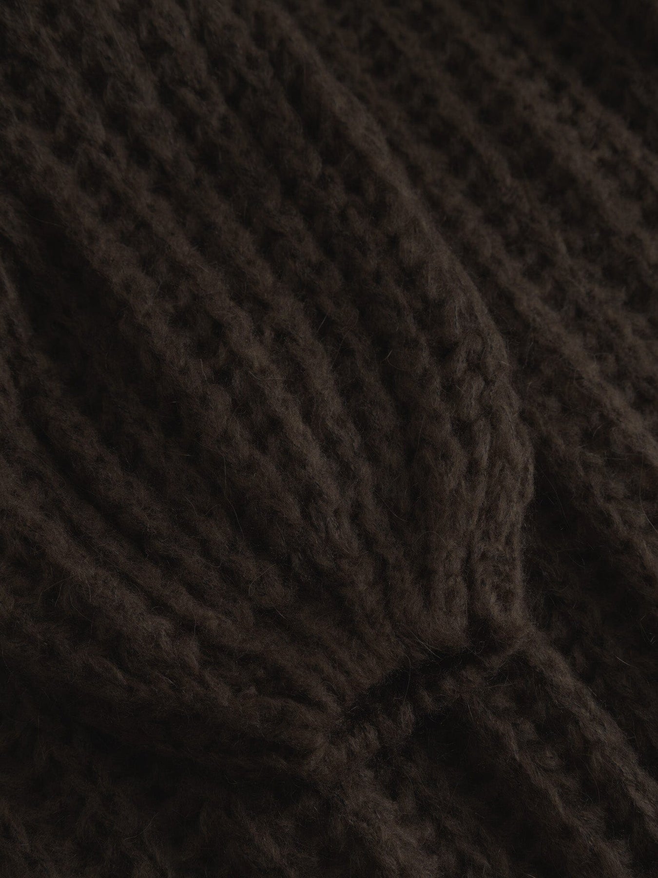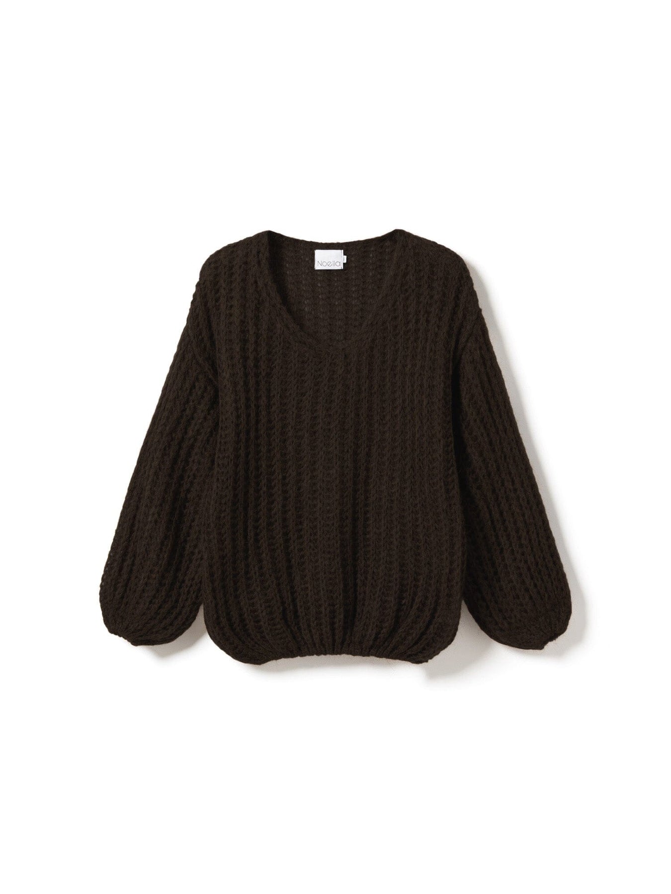 Mørkebrun striktrøje fra Noella med en ribstrikstruktur og voluminøse ærmer. Trøjen har en løs pasform og sænkede skuldre.