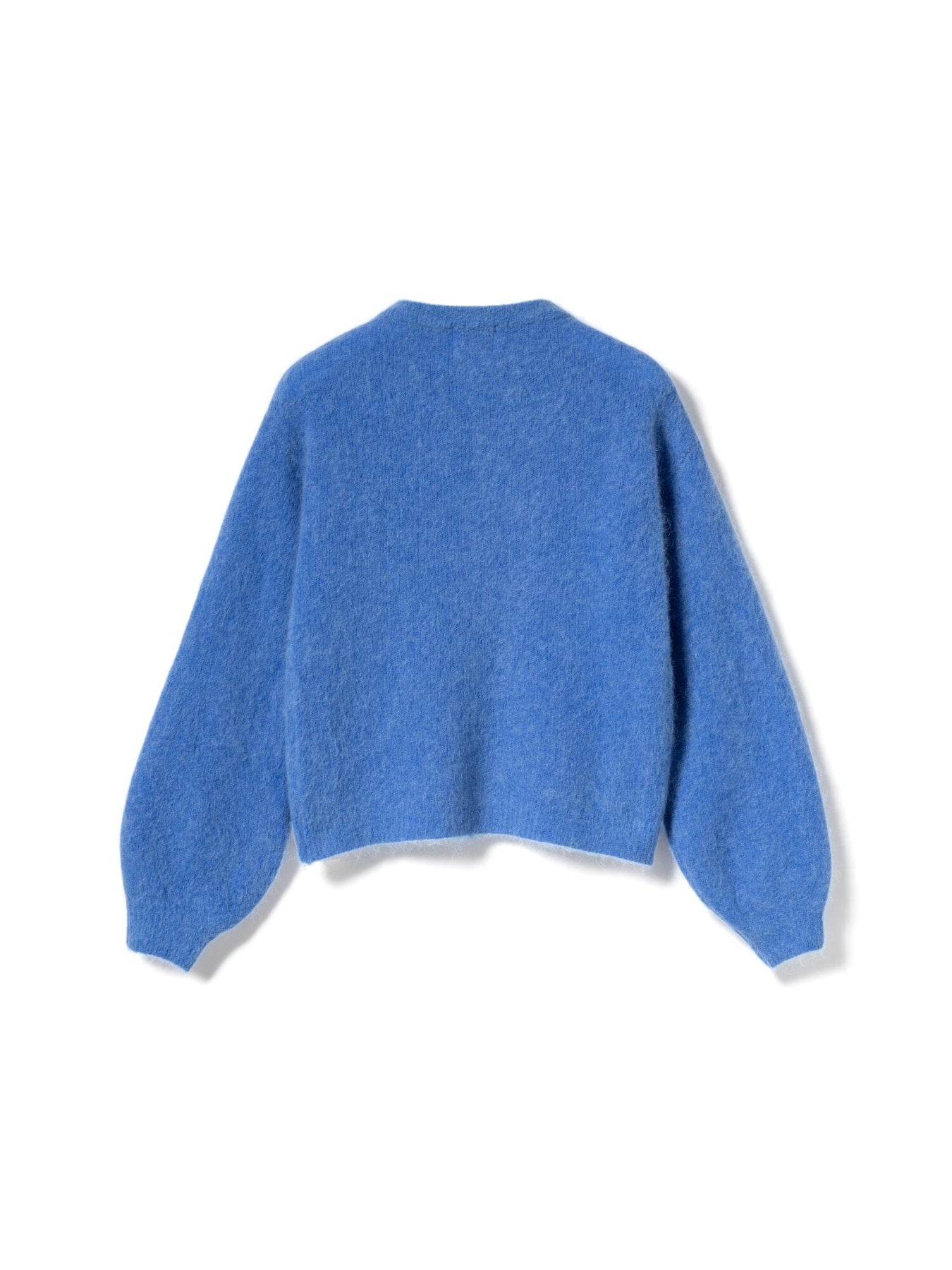 Strikket cardigan fra Noella i en lys blå nuance. Den har rund halsudskæring og knaplukning foran med lyse knapper. Ballonærmerne og den korte længde giver cardiganen et særpræg.