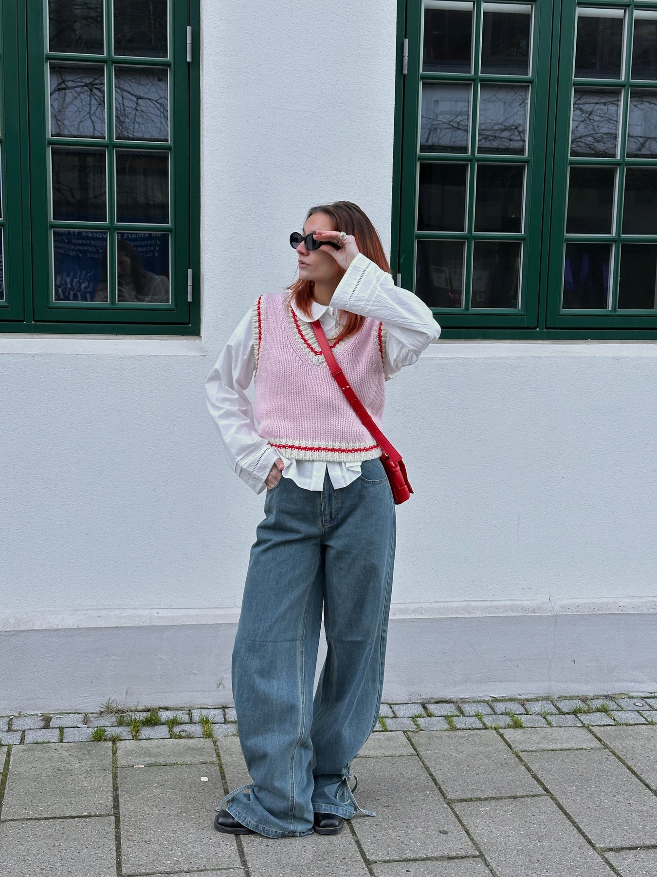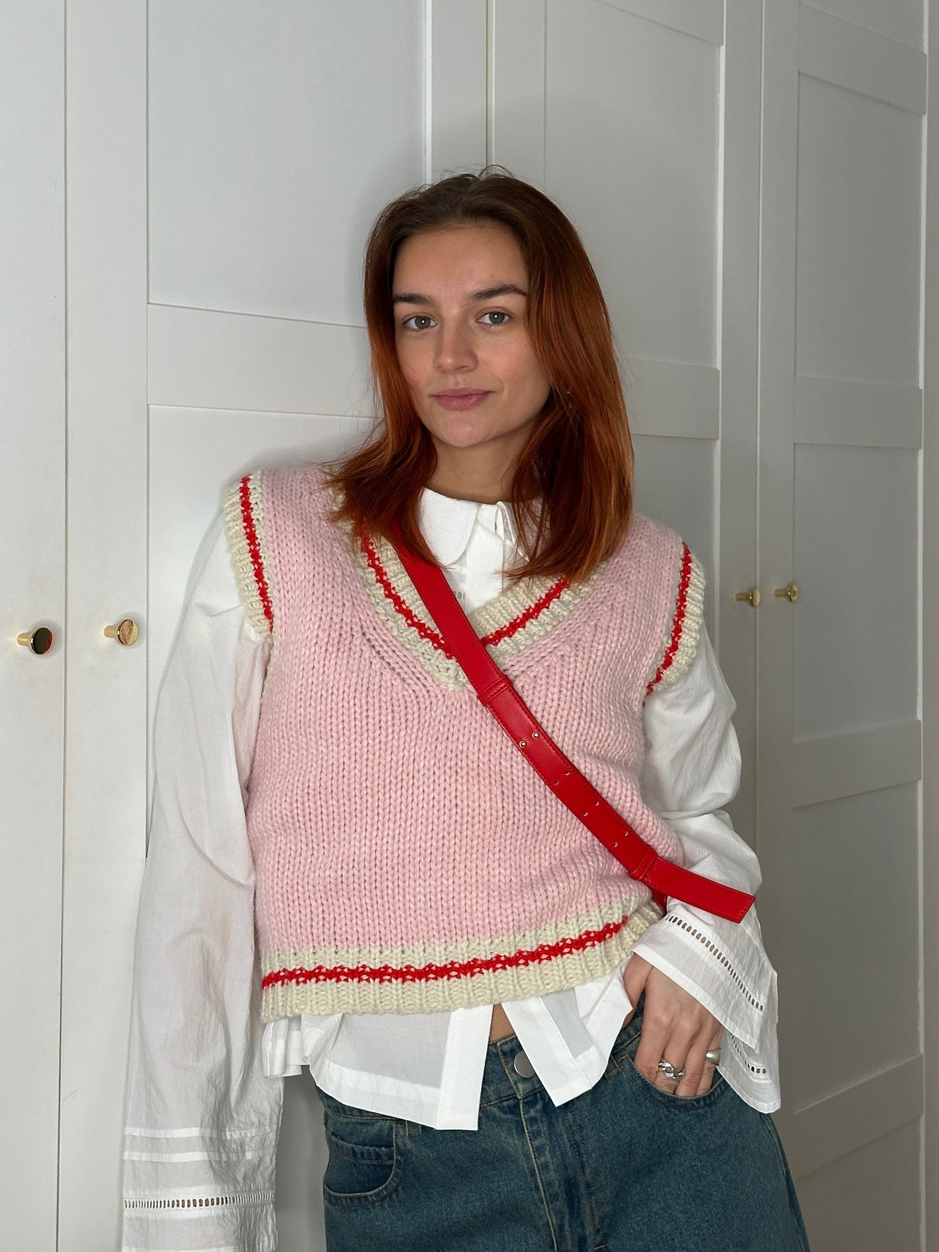 Strikket vest fra Noella i pink og creme med røde striber. Den har v-halsudskæring og er uden ærmer. Vesten er strikket i et tykt garn med et stribet mønster.