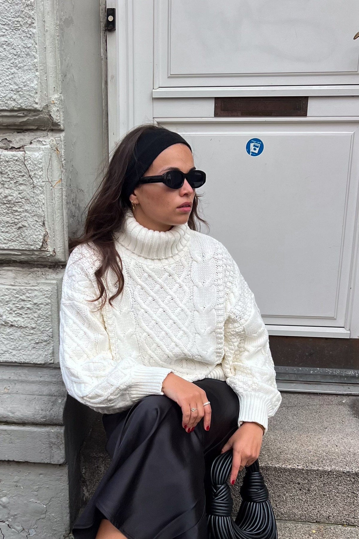 En off-white striktrøje fra Noella med kabelstrikdetaljer på forsiden. Trøjen har en høj rullekrave og lange ærmer med flettemønster.