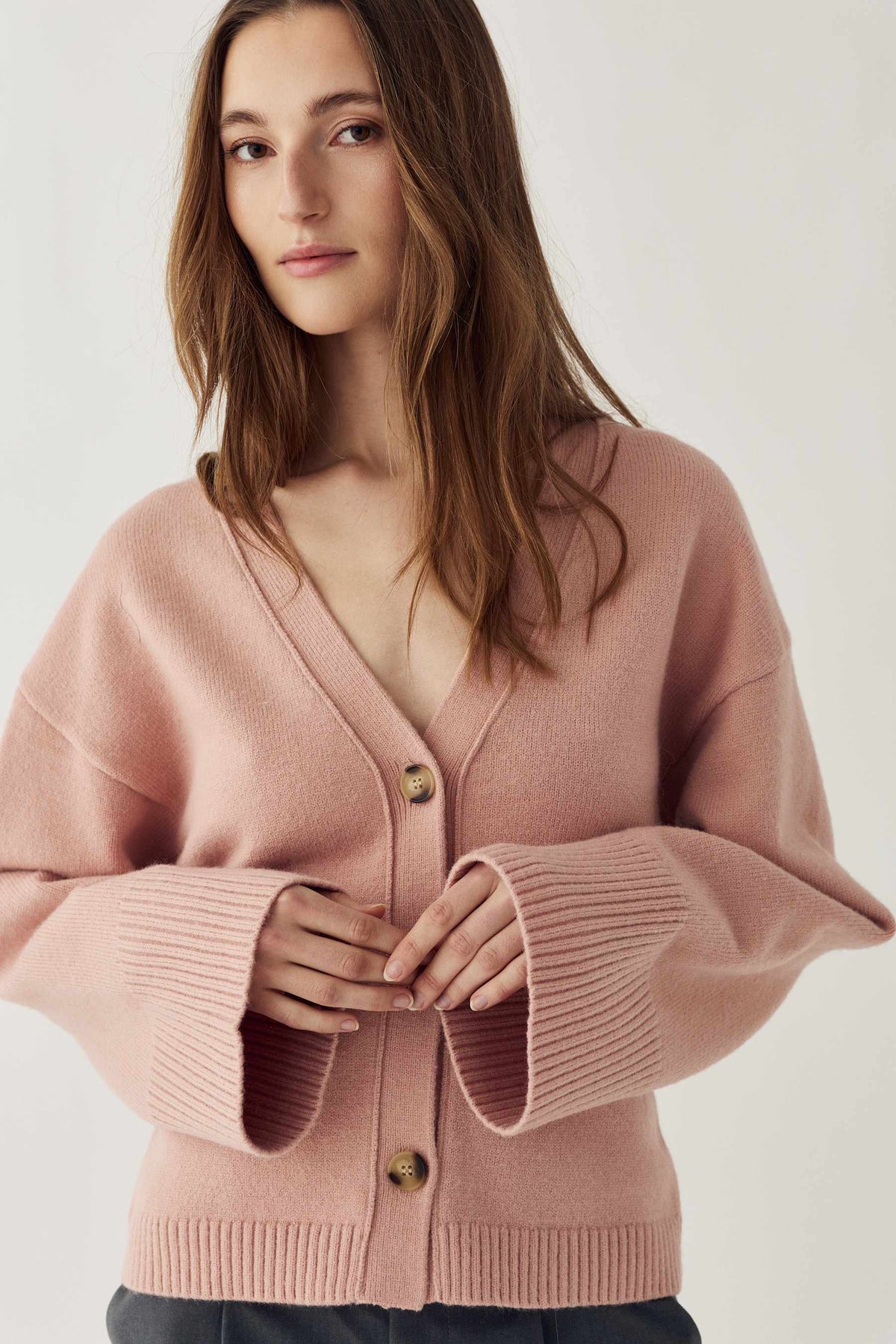 Strikket cardigan fra Noella i lyserød. Den har V-hals, tætsiddende pasform og voluminøse ærmer med ribbede manchetter.