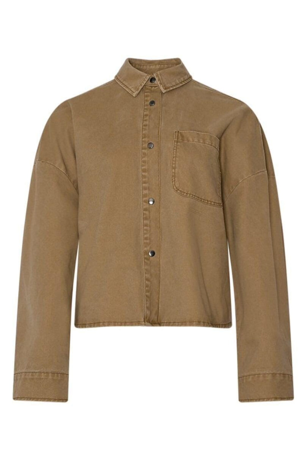 En skjorte fra Noella i en olivengrøn farve. Skjorten er lavet af 100 % bomuld og har dekorative syninger samt knappelukning med metalliske knapper.