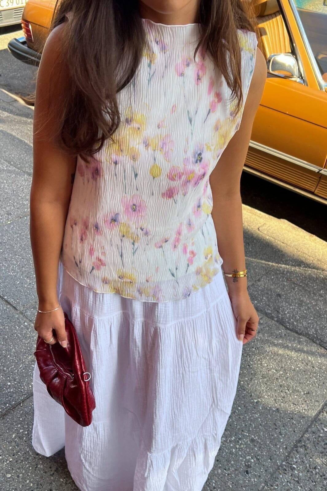 Ærmeløs top fra Noella med blomsterprint i hvid og pastelfarver. Toppen har en rund halsudskæring og er dekoreret med salatkanten, der skaber bevægelse i stoffet.