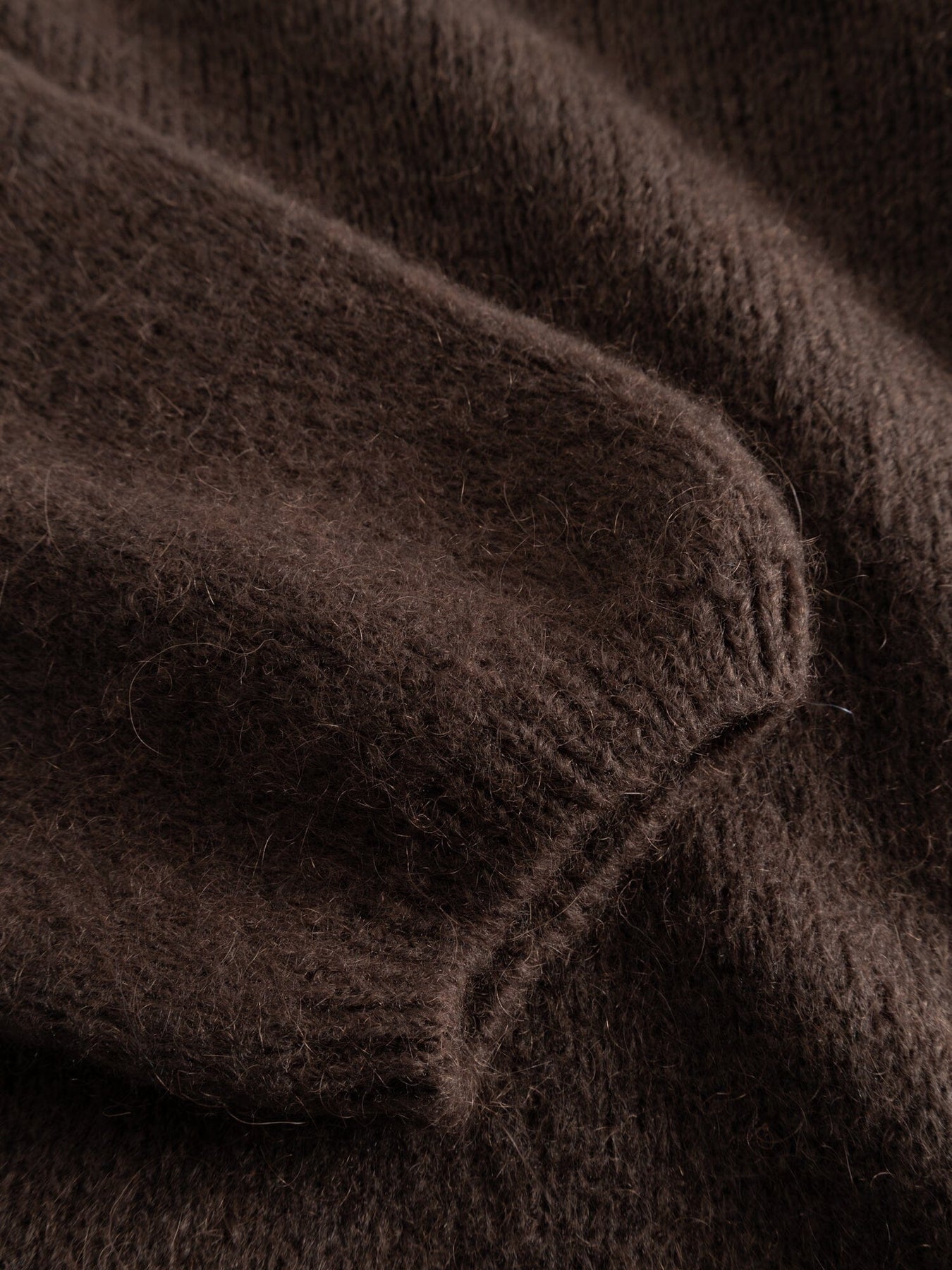 Mørkebrun striktrøje med puffede ærmer og cropped design. Den bløde strik har en rund halsudskæring og en løs pasform, der giver god bevægelsesfrihed.