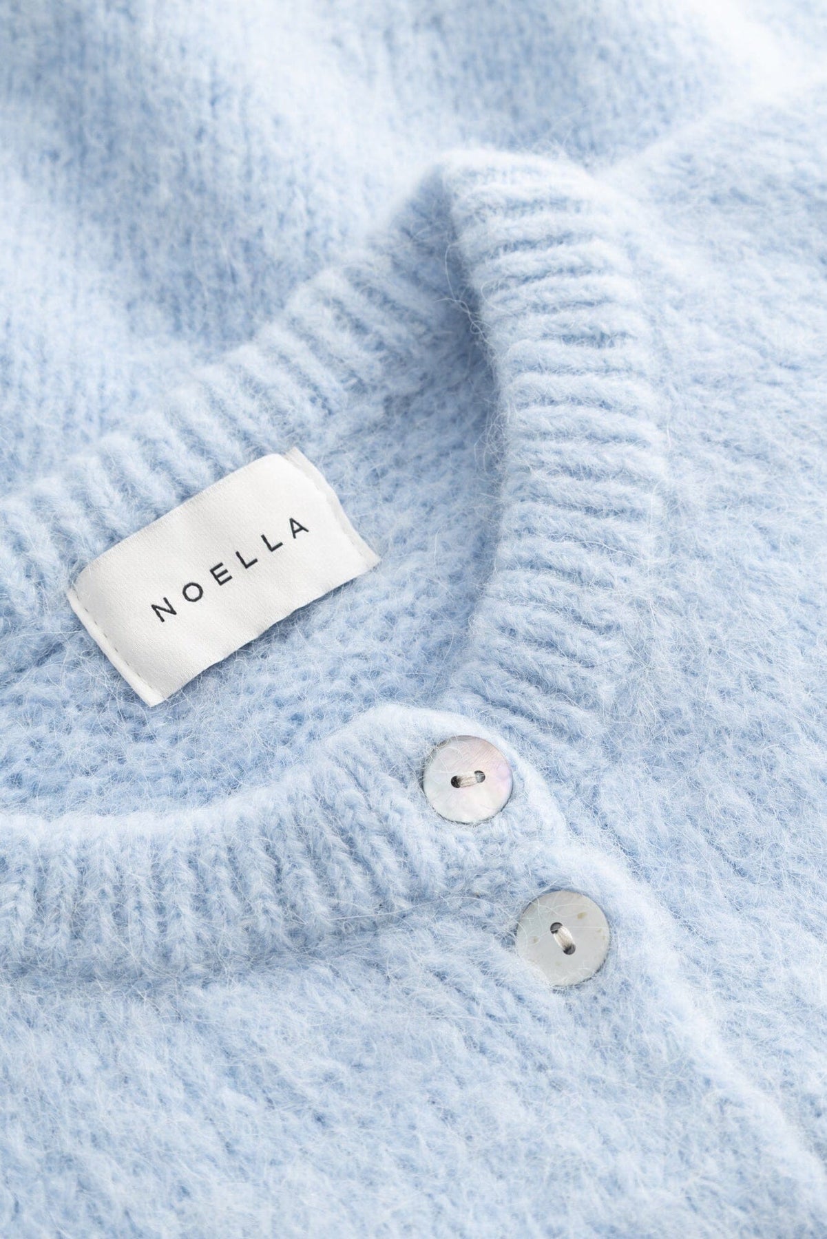 Lyseblå strikket cardigan fra Noella med knapper langs forsiden. Cardiganen har ribstrik ved manchetter og nederste kant samt en rund halsudskæring.