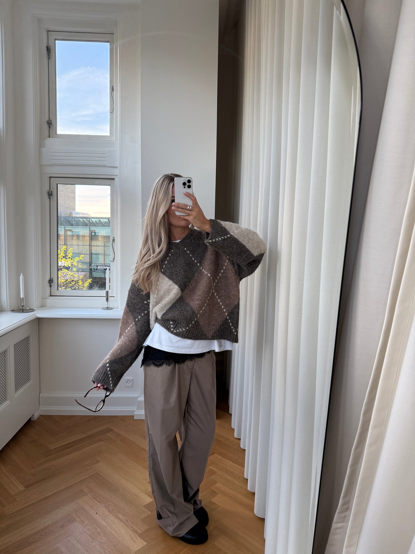 Strikket cardigan fra Noella i brune og beige nuancer med et klassisk argyle-mønster. Cardiganen har en V-udskæring og lukkes med knapper.