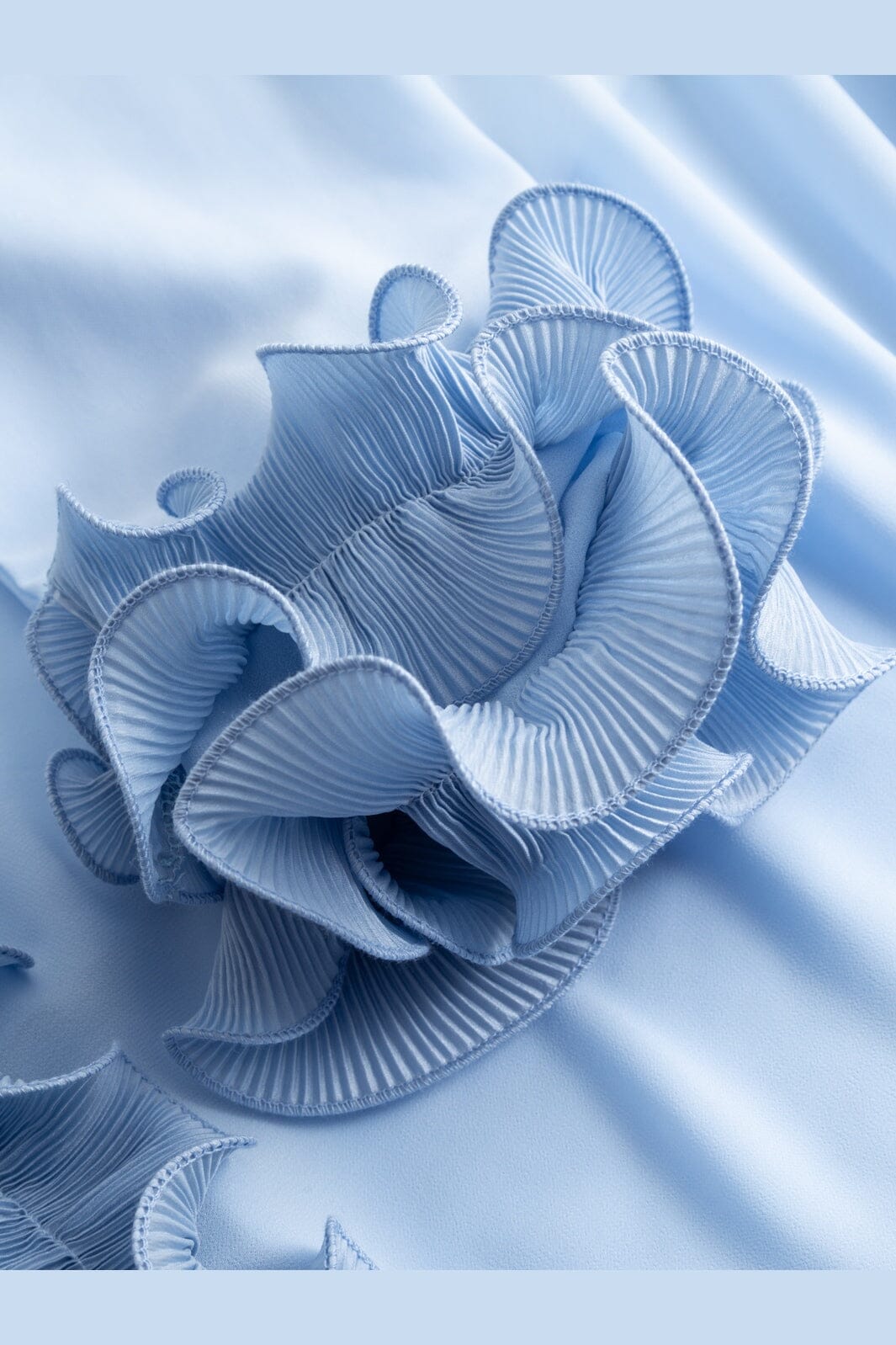 Lyseblå bluse fra Noella i 100 % polyester. Blusen har lange ærmer, høj halsudskæring med brede bindebånd og krøllede, plisserede bånd ved ærmerne og kanten.