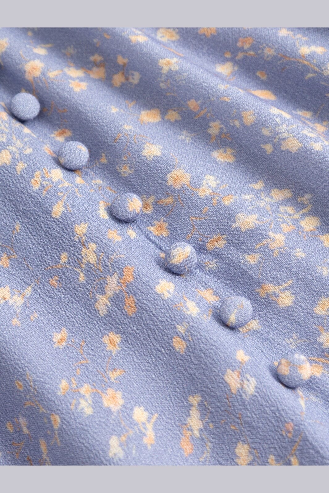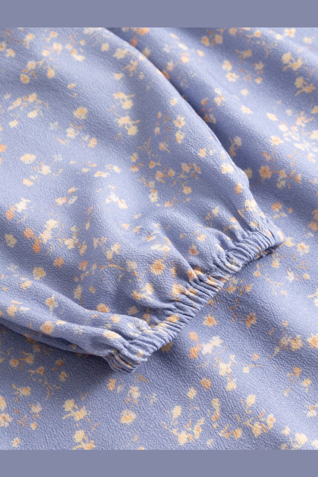 Maxikjole fra Noella med et blomstret print på en lyseblå baggrund. Kjolen har 3/4-lange ærmer og en dyb V-udskæring.