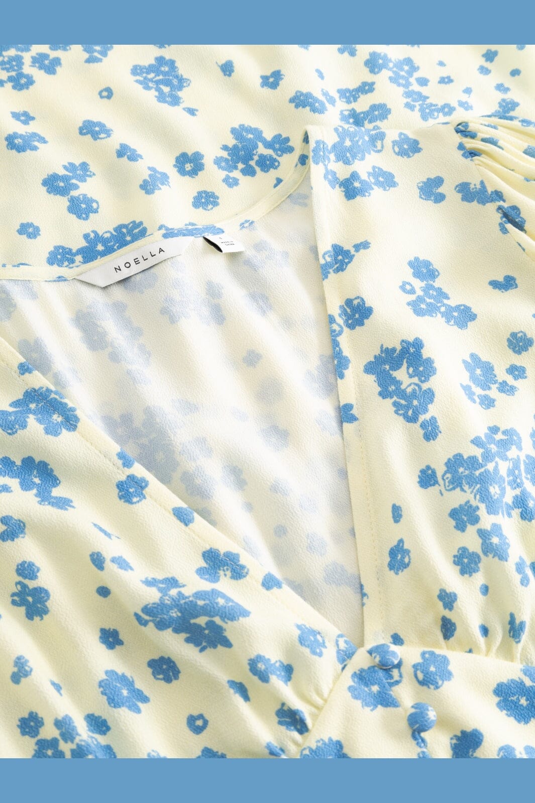 Kjole fra Noella i gul med blåt blomstermønster. Kjolen har en dyb V-udskæring og korte ballonærmer med volumen.