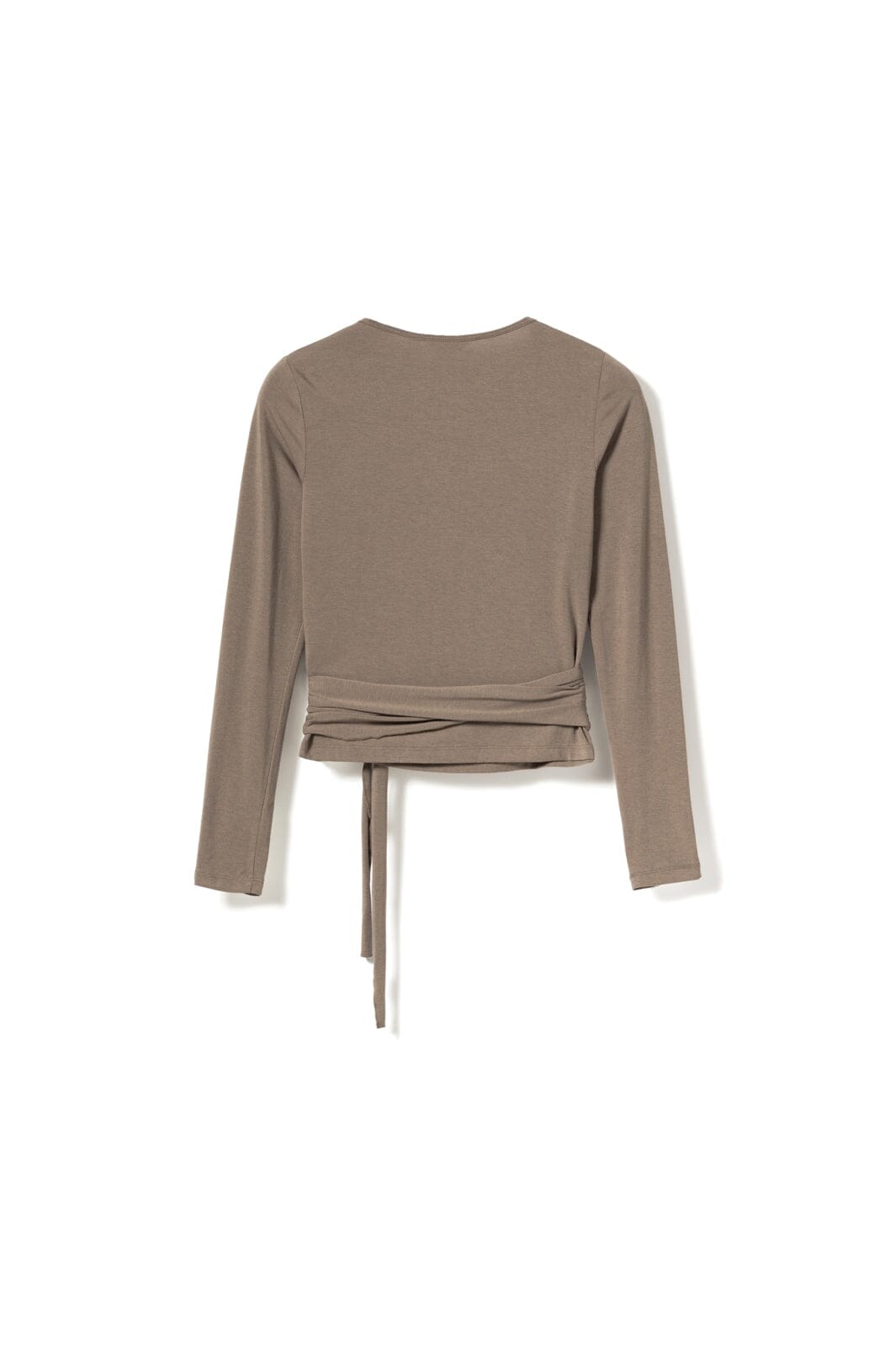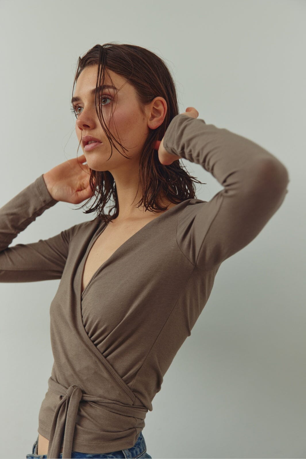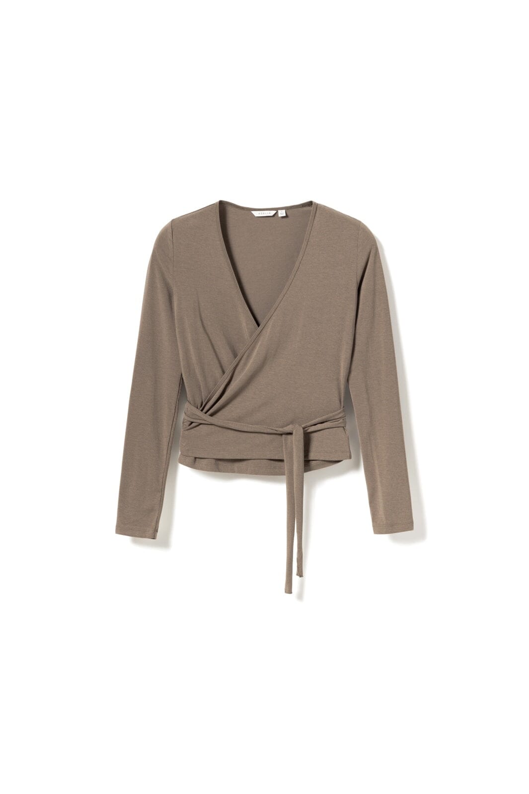 Top fra Noella med slå-om-design i en gråbrun nuance. Toppen har lange ærmer og bindebånd i taljen.
